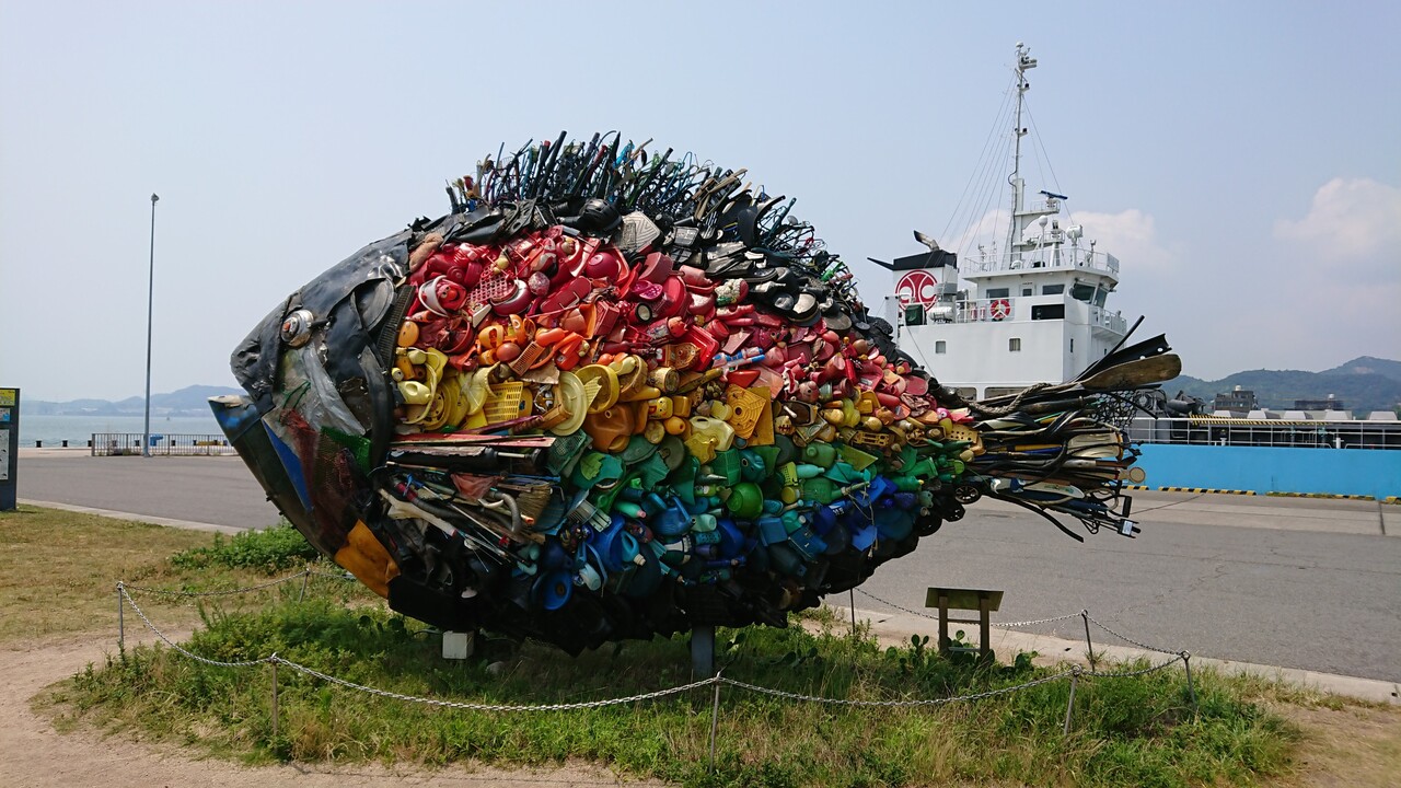 JR宇野駅から宇野港へ行く途中には色々なモニュメントがありこちらのチヌは海側にある大きなチヌのモニュメントです、近くで見ると色々な廃品で出来ているのが分かり面白いです、瀬戸内国際芸術祭が開催される直島へのフェリー乗り場も近くにあり芸術的な雰囲気が味わえる景色の綺麗な場所です。