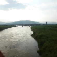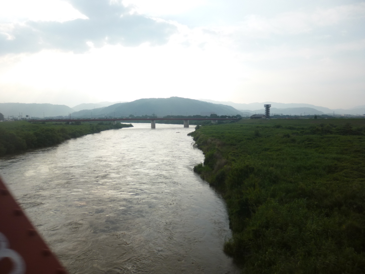 京阪電車が八幡市駅を通過し京都方面に向かうと、木津川と淀川の鉄橋を通ります。木津川は、周囲を濃く深い緑に囲まれ、前日の雨ためか水量もかなり多かったです。この先で宇治川、桂川と合流し、大阪平野に流れ込む淀川になります。一年で一番力強さを感じる光景でした。