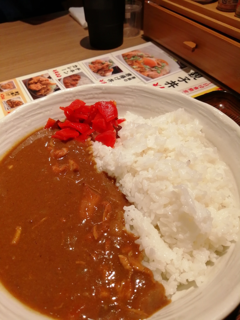 ランチでは、親子丼やカレーや唐揚げ定食が比較的リーズナブルな価格で食べることができます。カレーは量もしっかりあって500円です。チキンカレーです。