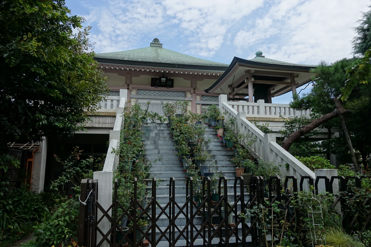 奥に進むと建物の2階部分に本堂と鐘楼が見えましたが、一般公開されていないようでジャバラの門扉が閉まっていて進めませんでした。2階への階段部分に鉢植えが並べられていて、お寺の方が花とか植物が好きなんでしょうかね。歴史はあるようですが、建物はコンクリート製で近代的な寺院です。