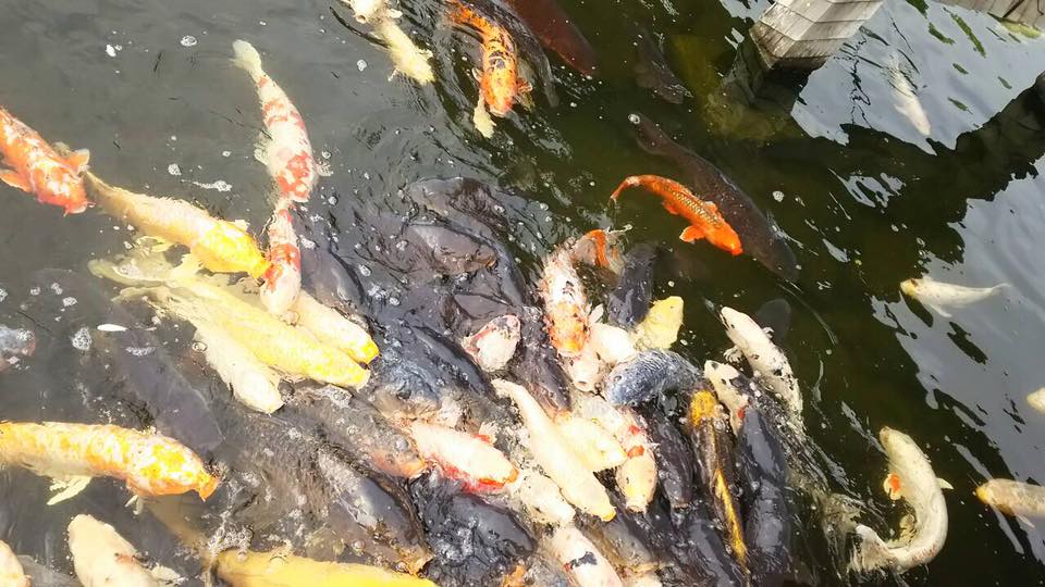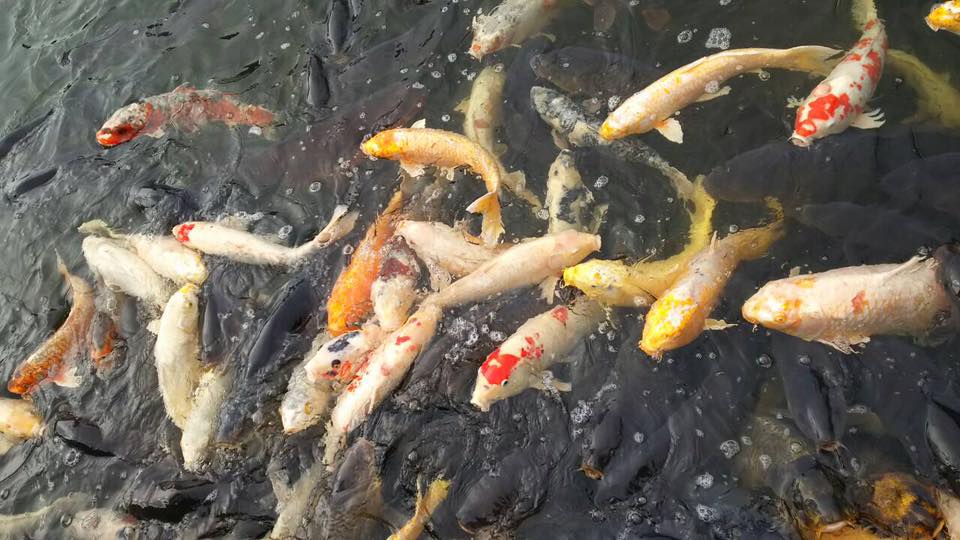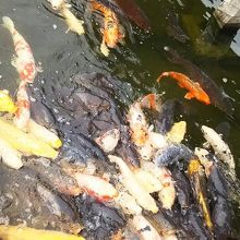 餌を買って池に投げると驚くほどの鯉が寄ってきます。