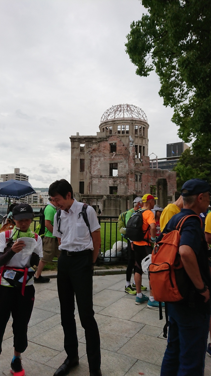 私は今年で4回目です。前日に広島のホテル入りして、午後六時、仲間達と説明会という名、三泊四日でリレーマラソンをします。の懇親会。東京、名古屋、京都、大阪などから集まった方達と旧交を暖めます。翌日、原爆ドーム前に集合して、グループごとに写真を撮り、黙祷をして、長崎11時の黙祷に向けて各グループ