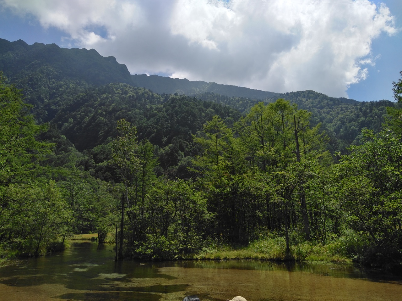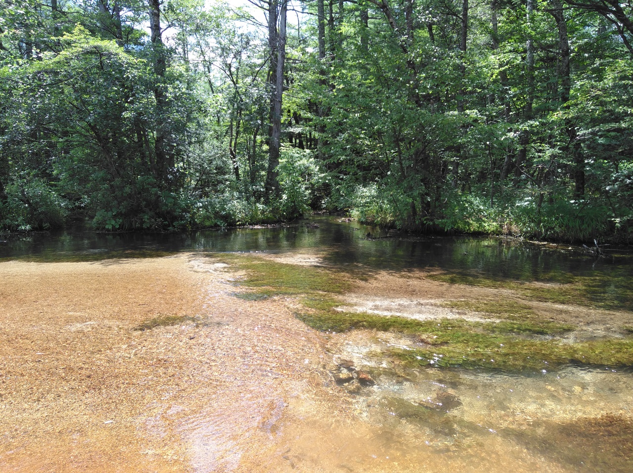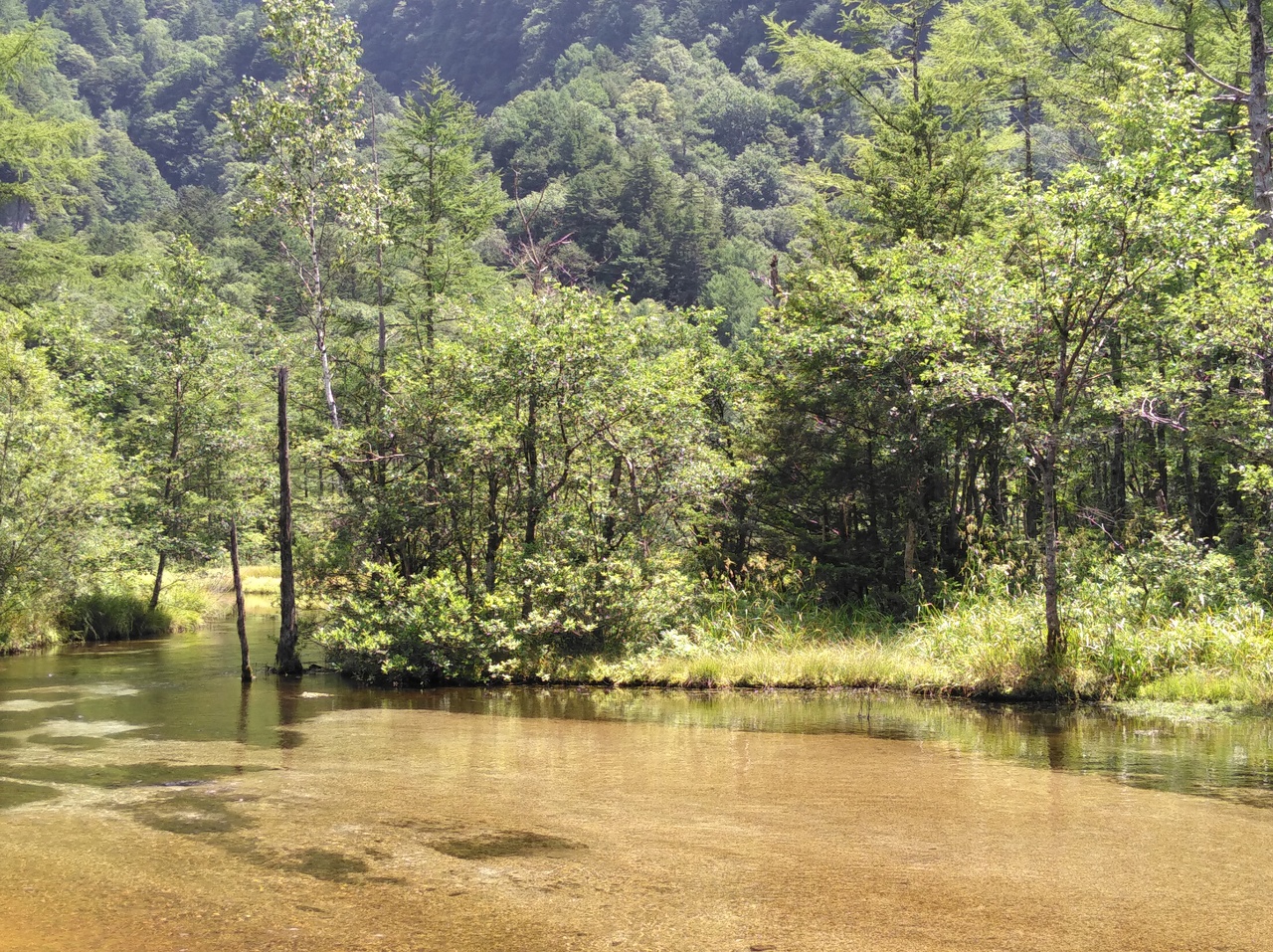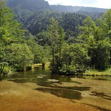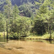 大正池から木道を歩き林間コース手前を右側に歩くと程なくして森に突然広がる浅い池が見えてきます。池と言っても緩やかな流れがあります。底から水が湧き出て透き通り美しく、カモが沢山泳いていました。土砂の流入により年々小さくなっているようです。以前は周りの湿原も全部が池だったと聞きました。