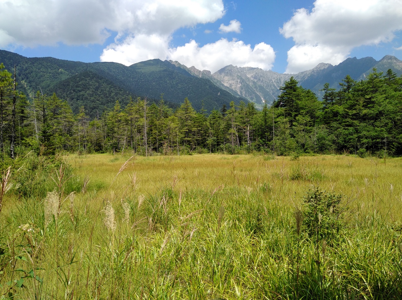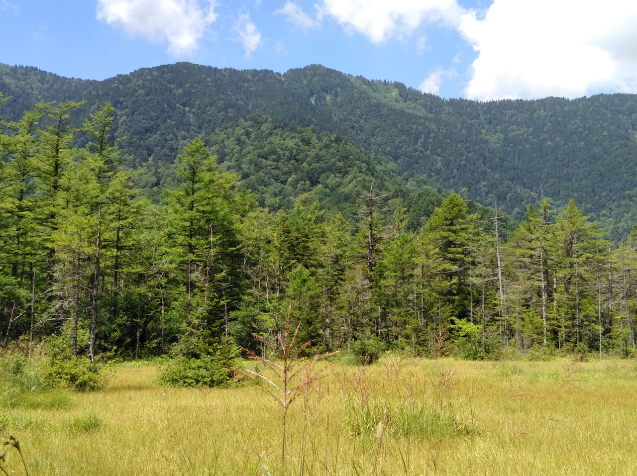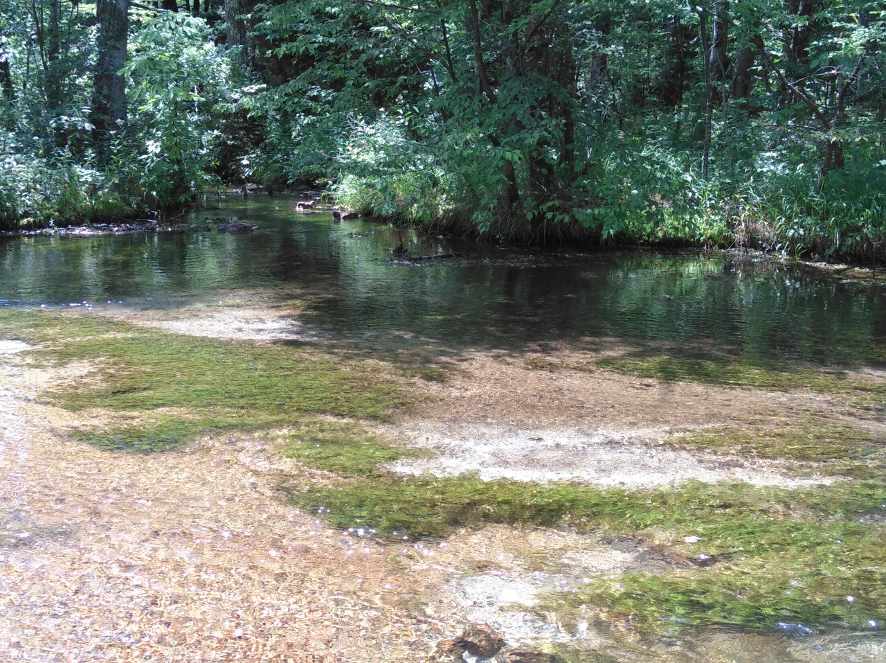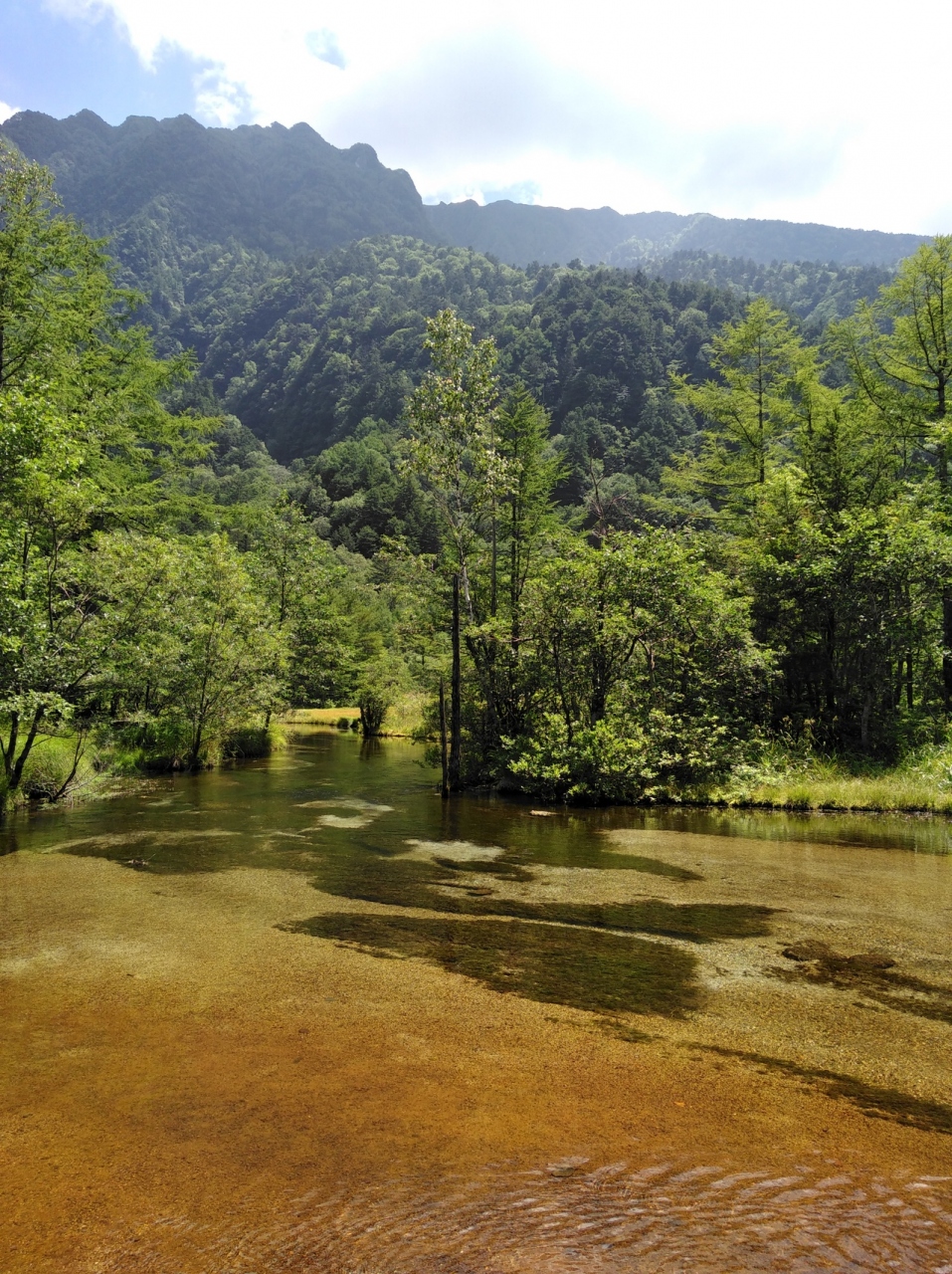 大正池から木道を歩き林間コース手前を右側に歩くと程なくして森に突然広がる浅い池が見えてきます。池と言っても緩やかな流れがあります。底から水が湧き出て透き通り美しく、カモが沢山泳いていました。土砂の流入により年々小さくなっているようです。以前は周りの湿原も全部が池だったと聞きました。