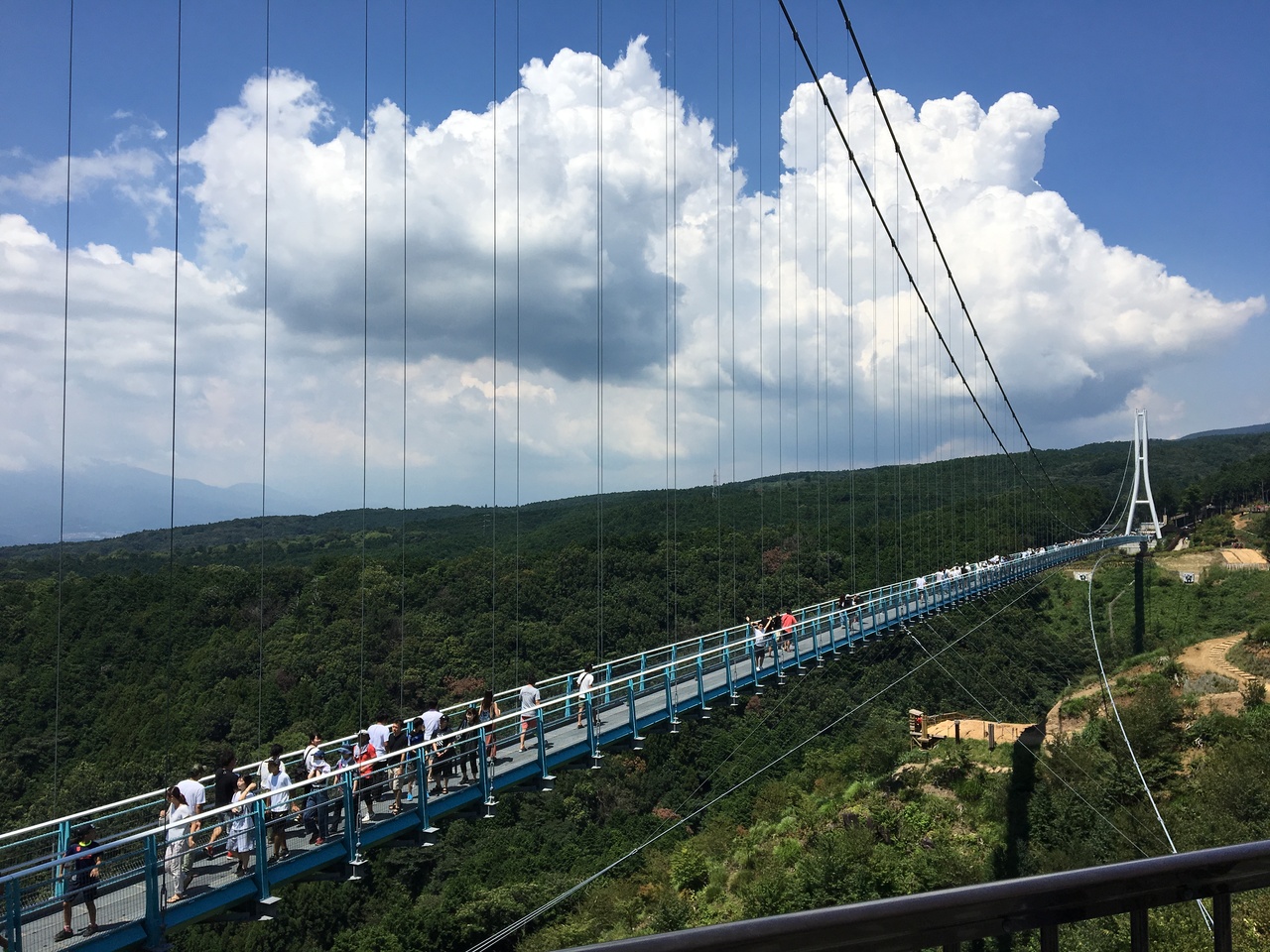 真夏の晴れの日に行ってきました。景色は最高でしたが、思っていたよりも揺れる。吊り橋だから当たり前なのですが、幅も行きと帰りの人の幅しかなくキシキシ言いながら揺れました。ですが、見回してみるとこわがっているのはほぼ私だけでしたので普通の方は大丈夫かと思います。横ではジップラインを楽しむコーナー、お土産コーナーもあるので観光地として成り立っています。駐車場もそこまで列をなす事なくです。箱根のすぐ裏ですし、箱根のついででもいいかと思います!