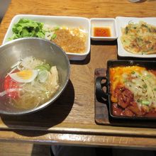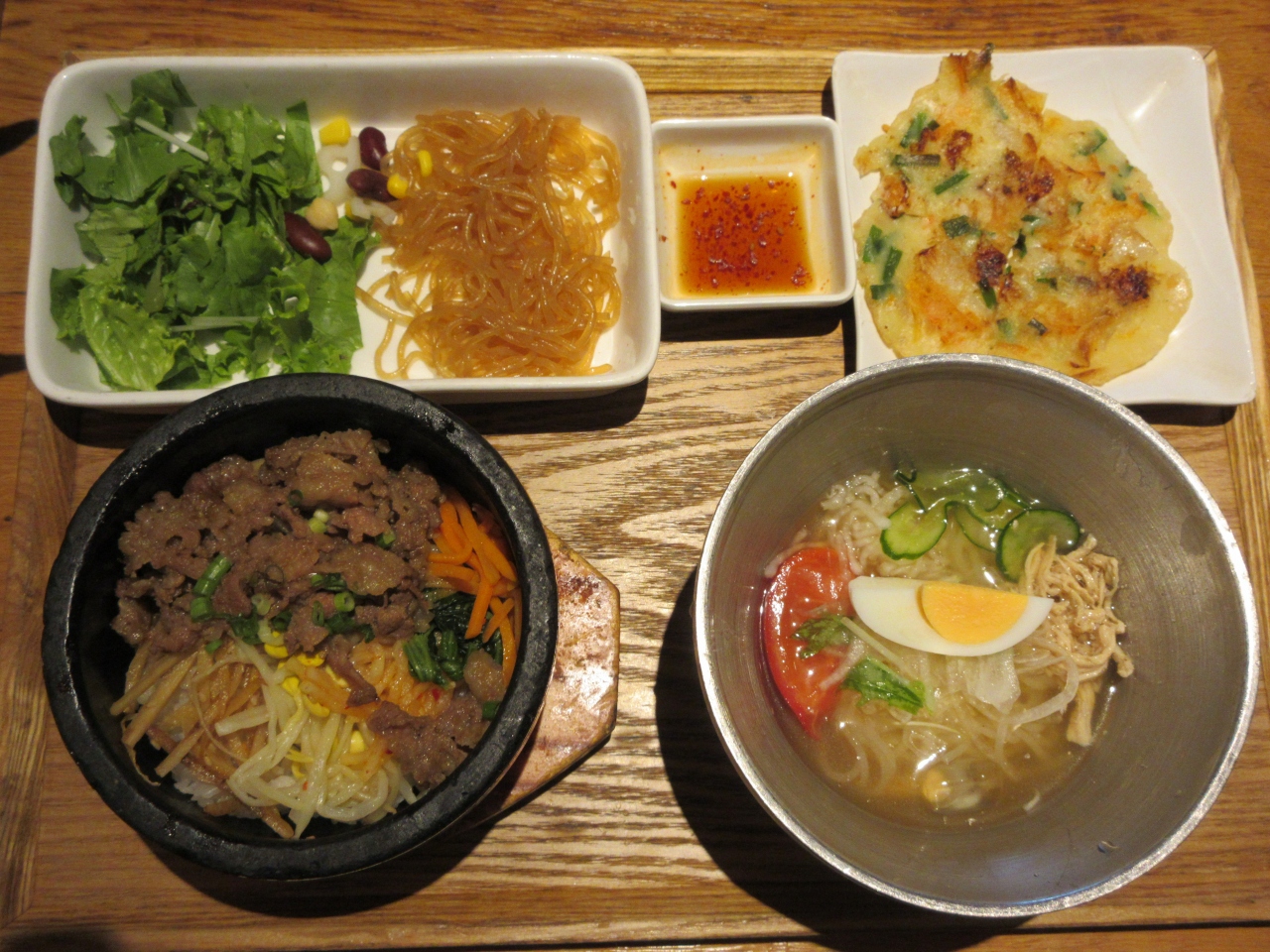 夏休み期間のにぎやかな東京ドームシティラクーアで昼食に利用しました。ラクーア2階の店はどこも行列ができていて韓美膳は並ばずに座れたので初めて利用しました。ランチセットが気になりましたが、暑かったので冷麺フェアのセットにしました。盛岡風冷麺と石焼ビビンバとチヂミとサラダのセットと冷麺とチーズカッタルビとチヂミとサラダのセットを注文しました。各冷麺はハーフよりも少量でしたが、石焼ビビンバとのセットは男性でも十分の量でした。どれも甘口ですが、ヤンニョムジャンを付けるとサラダは美味しくなり、コチュジャンをたっぷり混ぜるとビビンバも美味しくなりました。ビビンバの牛肉が多くて満足しました。