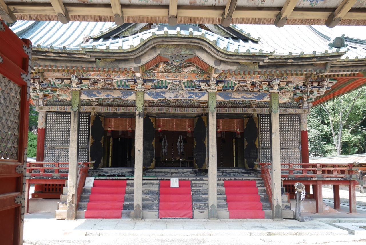 日枝大社のすぐ近くにある末社です。お盆過ぎの真夏に訪れました。駐車場から急な階段を登っていくと鳥居があり、さらに登っていくと境内に着きます。冬に訪れた時は、社務所が閉まっていましたが、今日は開いていました。また、神社の正面の唐門も開いていました。日光東照宮と比べるとかなり小振りですが、権現造の社殿は日光に先立ち創建され、ひな型になったといわれています。日吉大社に隠れていますが、立派な神社でした。また階段を登り切った背後には琵琶湖や近江富士がきれいに見えます。