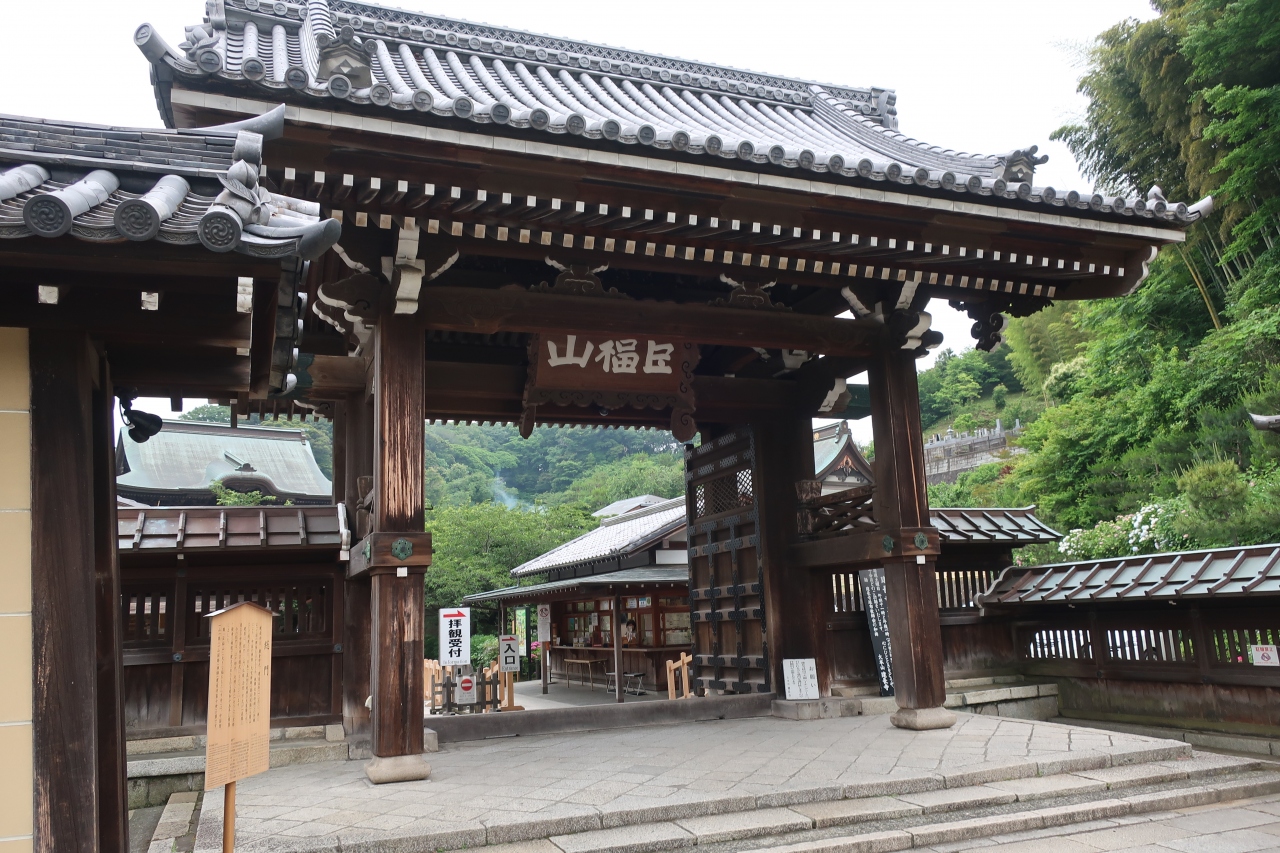 建長寺の境内への入口、入山券売り場の手前にある門が総門です。昭和15年に京都の般舟三昧院から移築された切妻瓦葺の四脚門です。別名 巨福門と言われていますが、門に掛けられた額をよく見ると巨の字がちょっとおかしい。何で一点多いのか調べてみると、第十世住職の一山一寧の筆で点を加えて、百貫の価値が上がったとか。面白い話がある物です。
