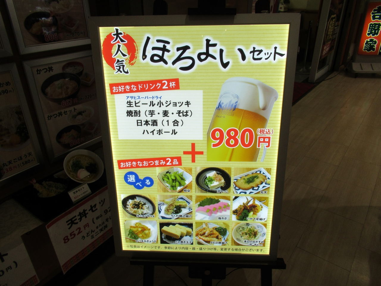 - 飲み物2杯とつまみ2品で980円というほろよいセット、満足できると思いますし、博多ならではのごぼう天うどんも500円で楽しめました