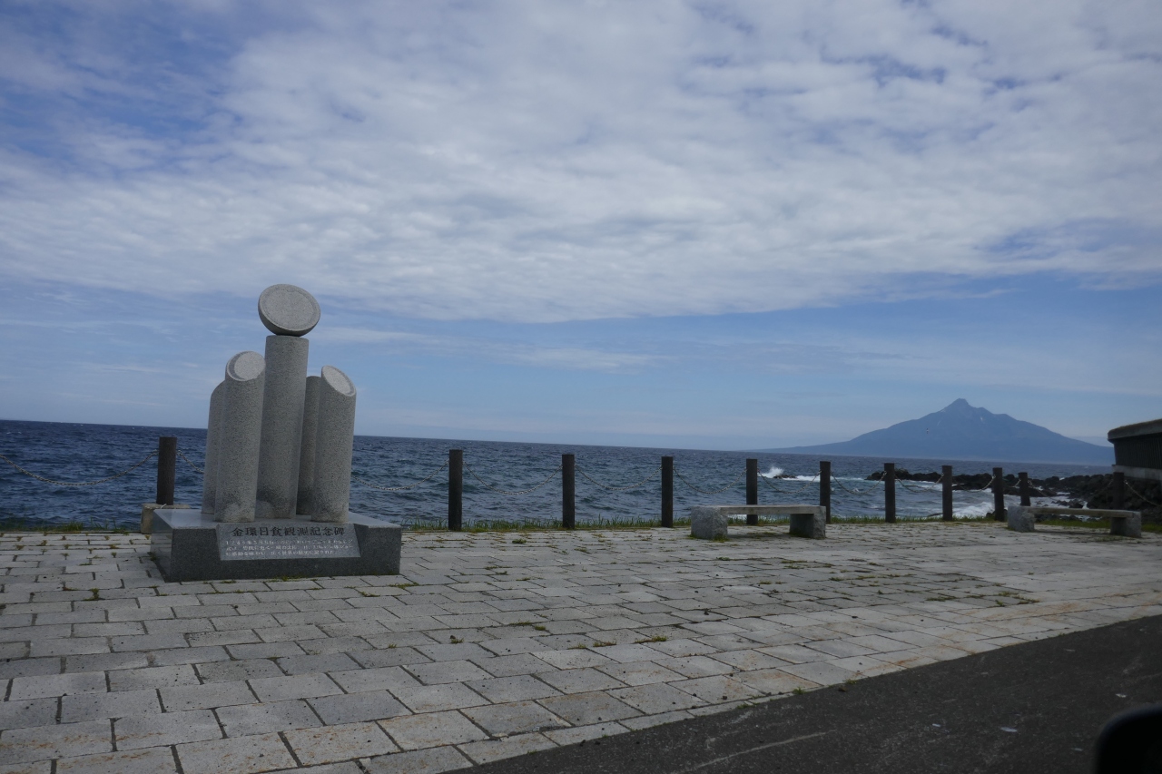 礼文島の東海岸沿いに「日食観測記念碑」があります。新しくデザイン性の豊かな石碑で、車を運転中にも視界に入りました。石碑の周辺はビューポイントとして整備されており、海越しに利尻山の景色が見えました。青空も見え、礼文島の中でも印象的な光景のひとつでした。
