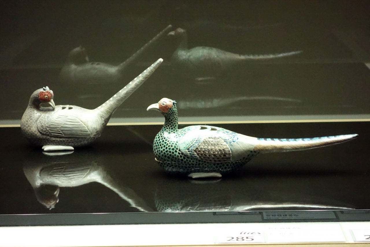 旅が好きなので国宝の色絵雉香炉(いろえきじこうろ)を見に行きました。重文に指定された雌もいて、仲睦まじくガラスケースに収まっています。ここは写真撮影が可能です。