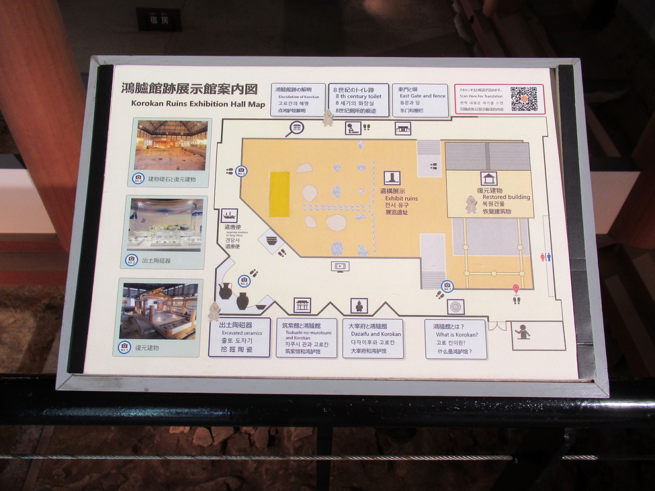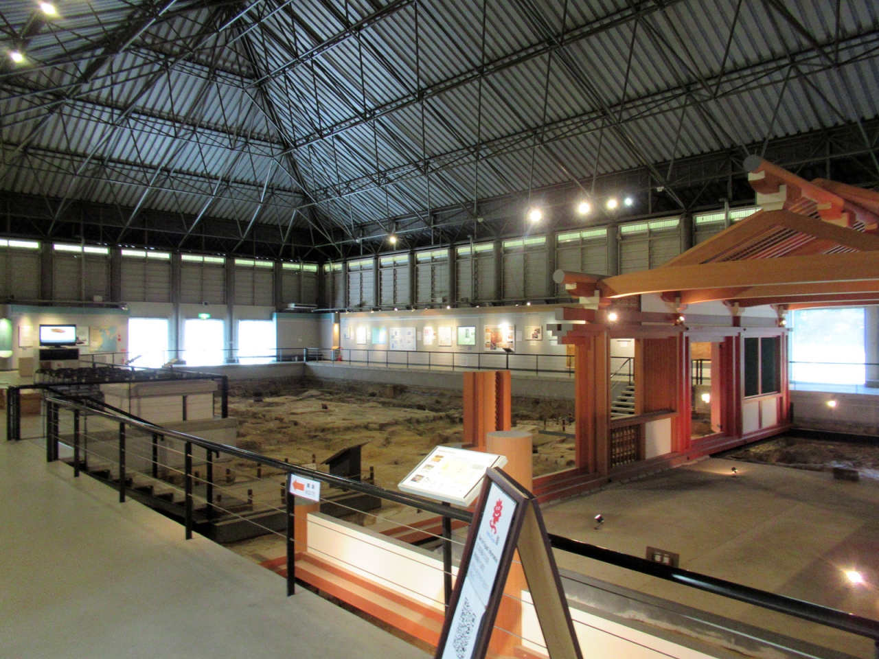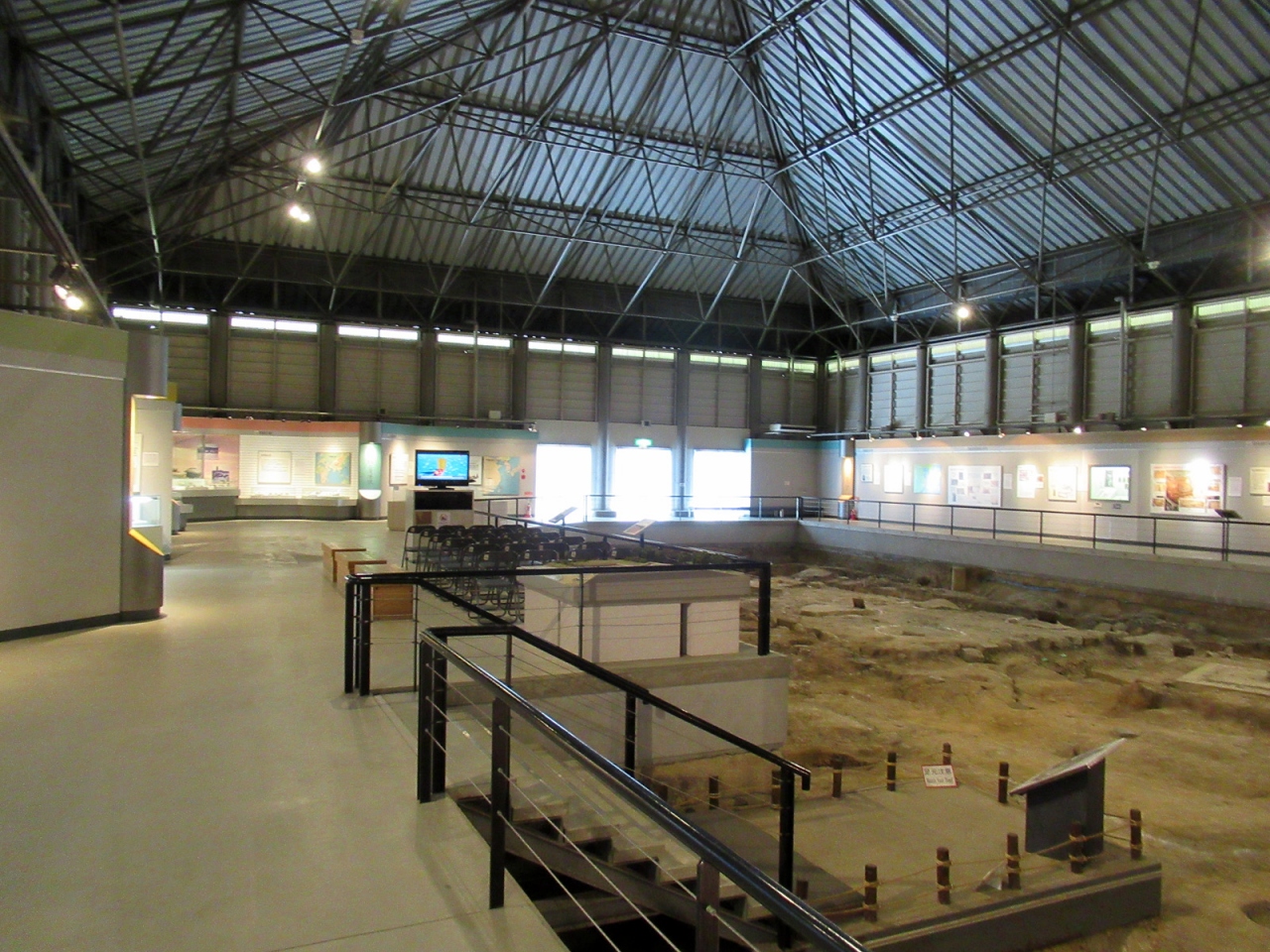 現在の大濠公園は、黒田長政が築いた大城郭址ですが、古代には外国との海の玄関口でもり、鴻臚館が建てられていました。鴻臚館は遣唐使が潮を待ったり、外国使節をもてなしたりした場所でした。こちらは発掘された遺構が保存されている場所になります。真夏の九州、雲一つないお昼近くとあって、先に訪れた「福岡城むかし探訪館」の係員の方から「暑いですよ」と忠告をいただきました。平日ということもあって館内にはどなたの姿もありませんでしたが、しばらくするとゴーッという音と共にエアコンの冷気。ありがとうございます。さて中央部には発掘された状態の遺構、周りには発掘された品々・説明パネルがならんでいました。千数百年前の建物の遺跡、歴史好きは一度は見ておきたい場所だと思いますが、そうでない人にとっては「それほどでもない場所だな」のような気がします。