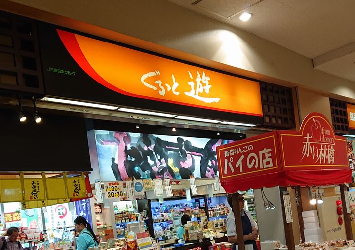 JR青森駅の改札でるとあるお土産屋さんです。店内には青森各地のお土産品が一通りそろっていました。店頭ではピーナッツやアーモンド、ピスタチオなど木の実が入ったおせんべいを焼いていました。小山せんべい店の商品で美味しそうでした。