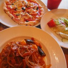 ミニサラダ、パスタ、ハーフピザ、そしてドリンクから成る。