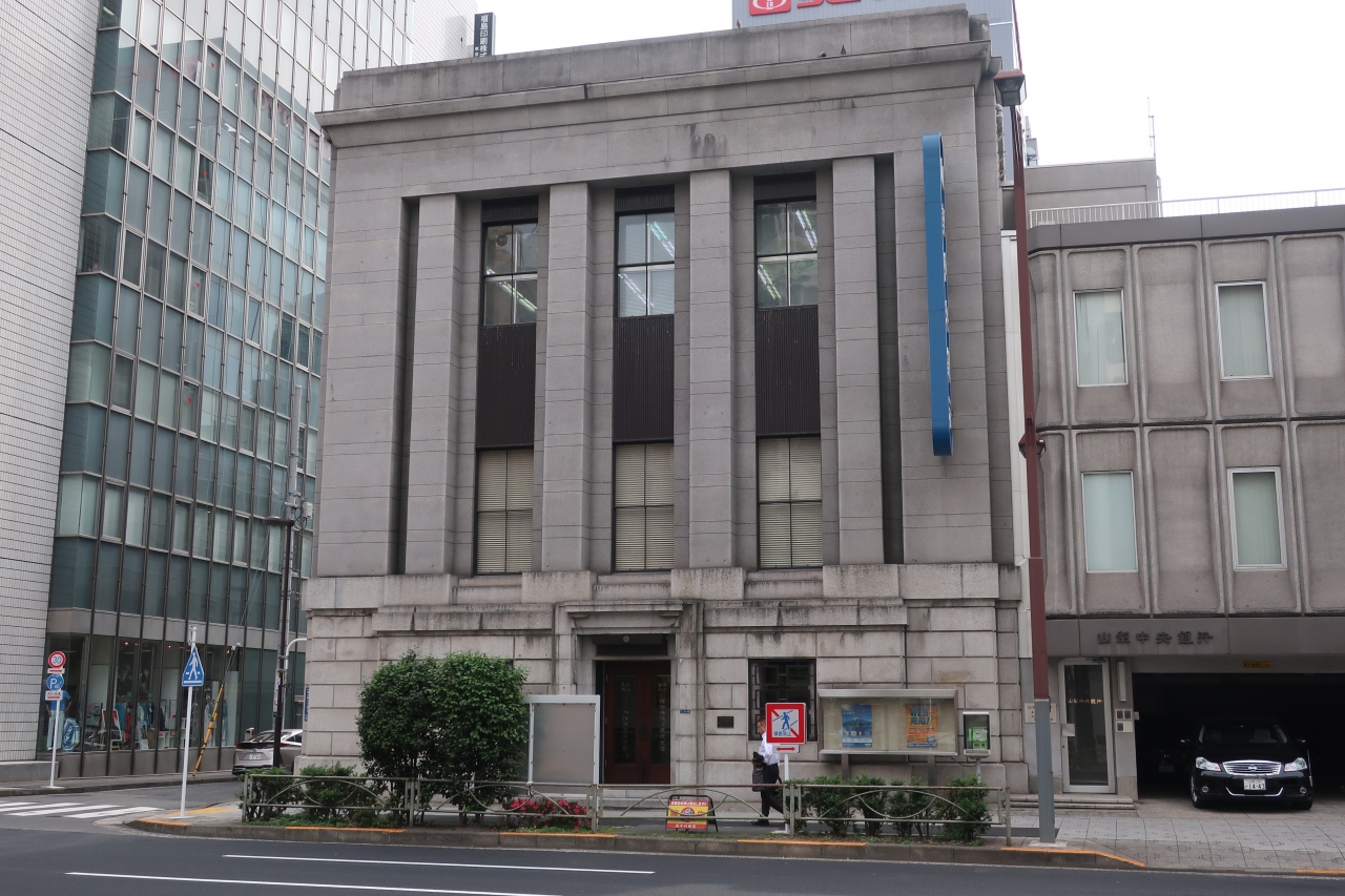 JR神田駅から中央通りを日本橋方面に行った今川橋交差点の先右手に山梨中央銀行東京支店があります。昭和4年に建てられた建物は、基壇部の上に、柱を並べたファサードは姿をしており、正に銀行建築の見本と言って良い建物です。悪く言えば箱みたいにも見えるのですが、お堅い銀行のイメージピッタリです。