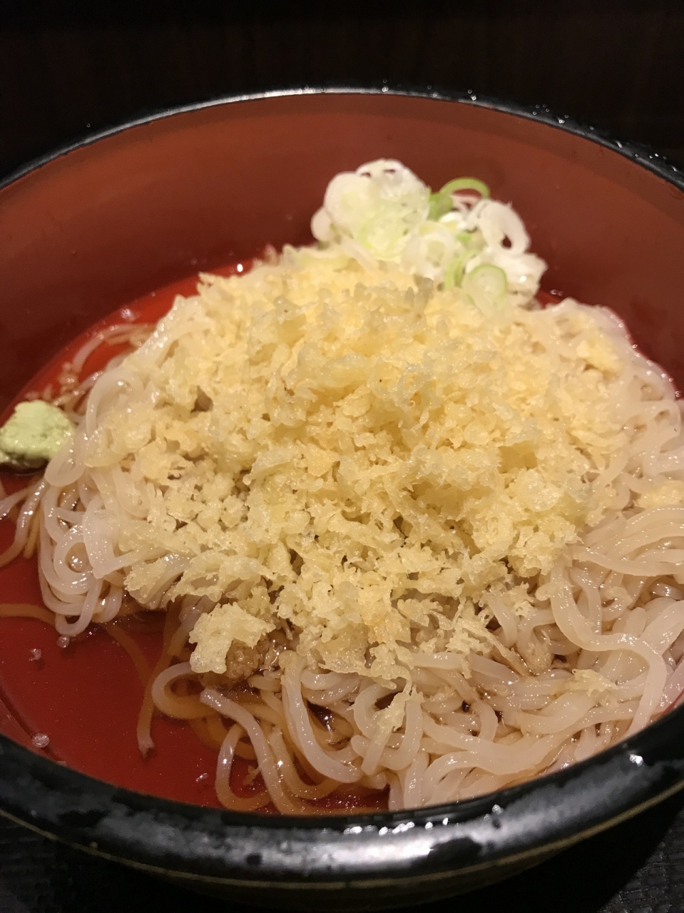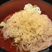 準備に時間ぎかかるのか、後から注文した人の番号がどんどん呼ばれます。10人近くに抜かれてついに登場した冷麦はぶっかけスタイル。若干透明感がある麺はお目にかかったことがない!コシが半端ない!天かすとネギとワサビで食べるシンプルさもよい!