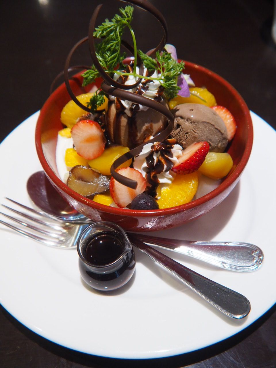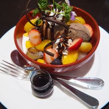 器に、栗、イチゴ、グレープ、ナシ、ブルーベリー等のフルーツやナッツを彩りよく盛り、チョコレートアイスを2スクープ分乗せ、生クリームをトッピングし、チョコレートやチョコレートソースでデコレーションしたもの。
