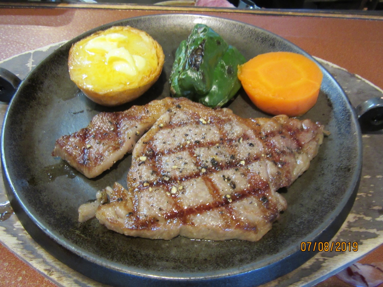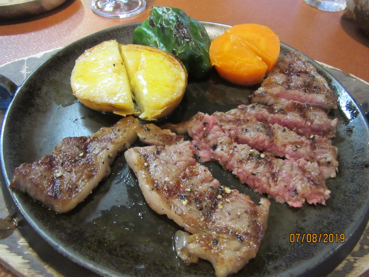 松阪牛ステーキ100グラムでしたが、肉が何と柔らかく美味しいことか、大感動、今までのステーキで一番でした。店は2階に上がりカウンター7席、テーブル2卓、カウンターの目の前でステーキを焼いてくれます。コースは、スープ、サラダ、ステーキ、ドリンクになっていました。接客も良く大満足の店で、ミシュランにも掲載されたそうです。ワイン2杯、土産に松阪牛のしぐれ煮1,400x2=2,800円(これも帰宅後味わいましたが、とろける美味さで絶品でした。)、ステーキコース4,500円とあわせて8,100円。