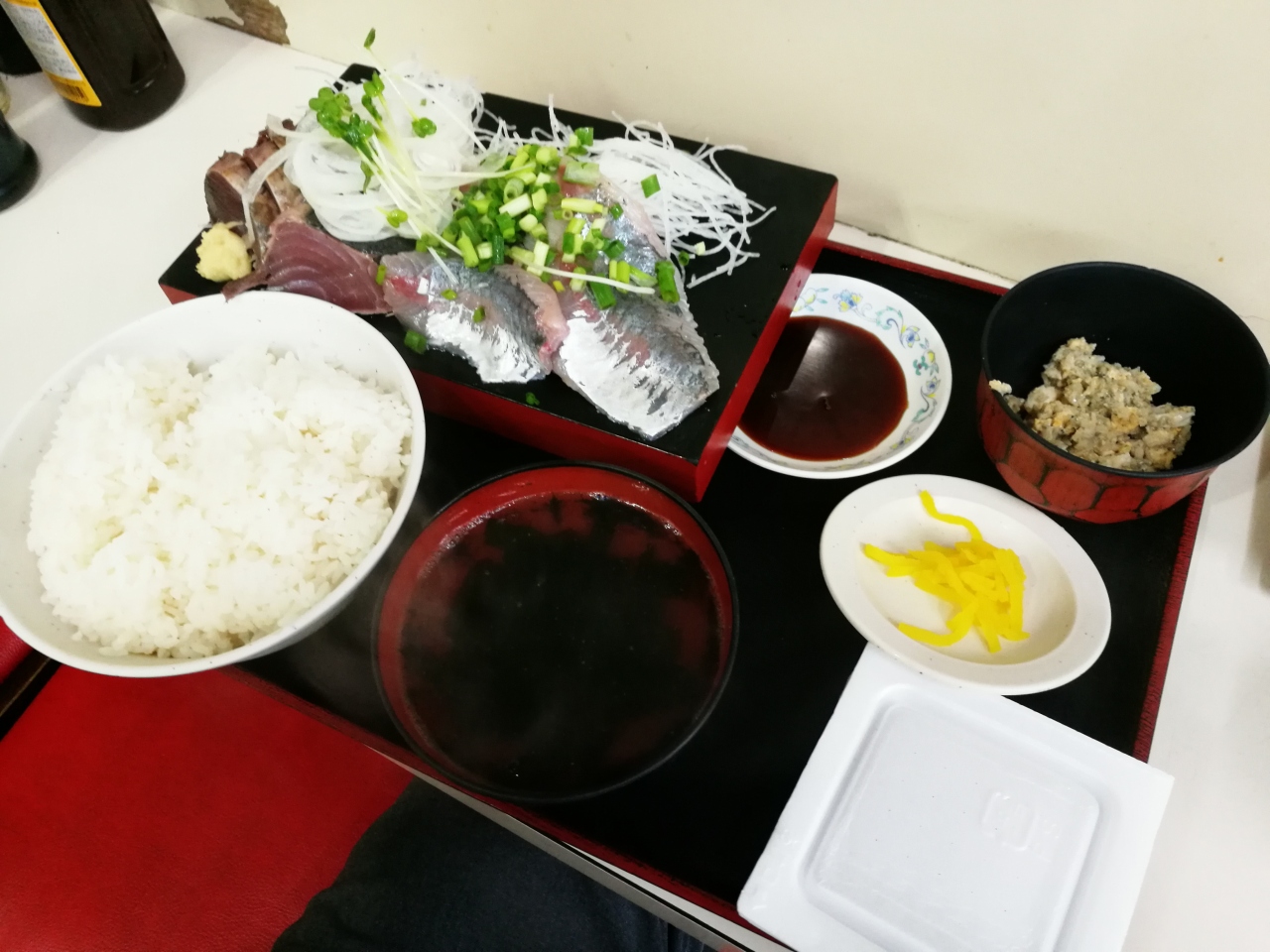 漁港の目の前と言う立地なので当然鮮度の良い海鮮料理がメインで、刺身2点盛り定食を食べましたがメインのアジの刺身と10品くらいから選べる刺身の盛り合わせと小鉢、納豆の付いた定食で1100円