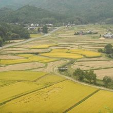 ビューポイントの一つが朝日観音・夕日観音に登る道の途中にあります。ちょうど稲刈りの時期で、刈入れを終えた田と稲穂がたわわに実る田のコントラストがある写真を撮ることができました。
