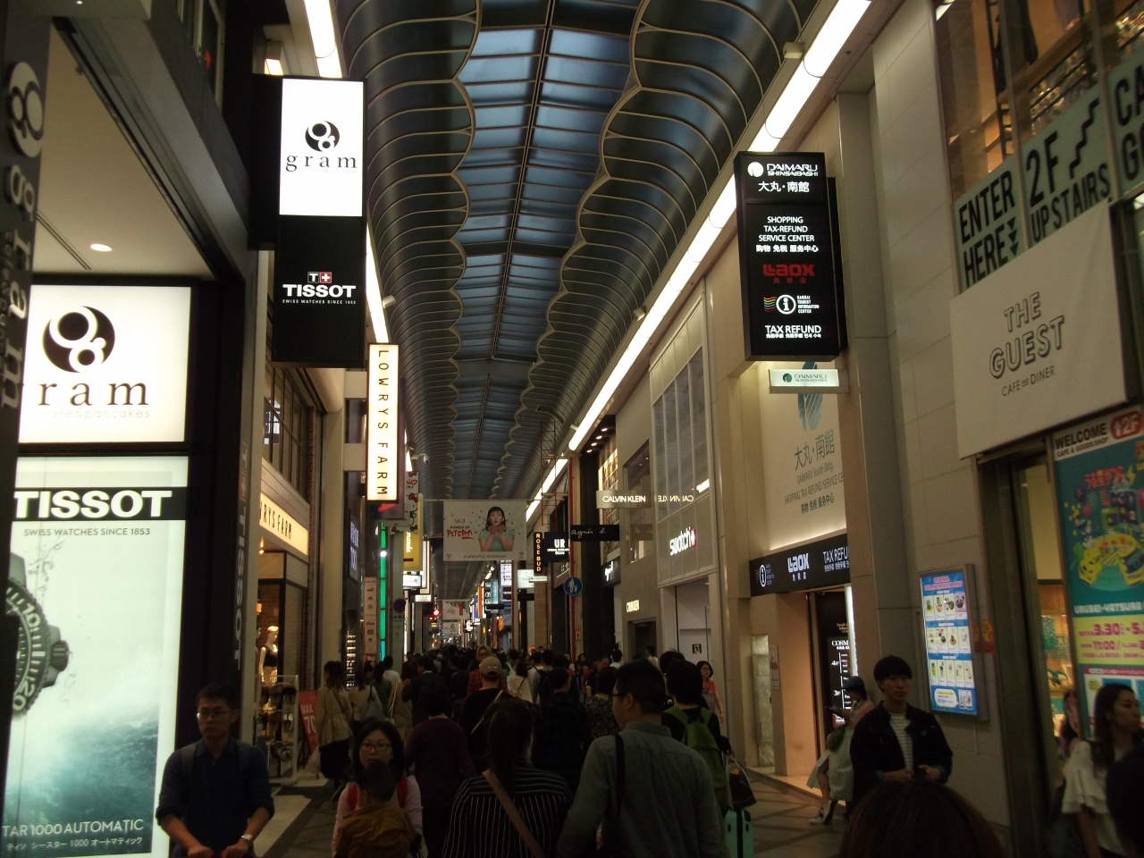 御堂筋と並行して、心斎橋駅あたりから難波近くまで続くにぎやかな商店街です。デパートに始まり、ファッション、化粧品、グッズ、飲食店といったお店が並んでいて、アーケードに覆われているので天候を気にせずお店をゆっくり眺めながら歩けるのが良いです。ここはいつ行っても混雑している印象しかありません。周りに注意しながら歩きましょう。