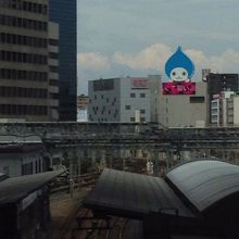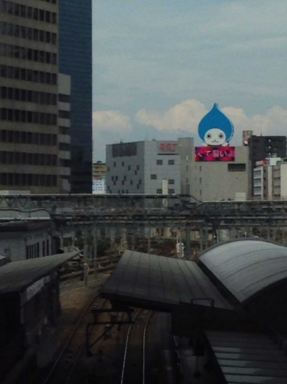 大阪駅に着くと3階の南北連絡橋にベンチがあったので休んでいると正面にインドみたいな頭をした顔が見えました。アドバルーンか何かかなと思ったらビルの上に設置されている看板のようで、どこかでみた覚えもある顔ですが、ダイキンのキャラクターでした。