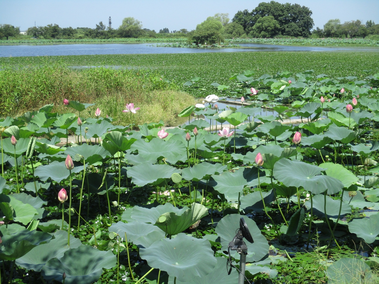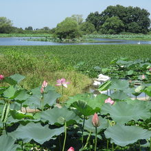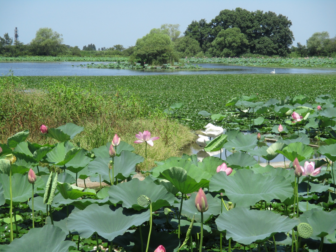 夏の瓢湖では、数羽の白鳥と鴨が泳いでおり、蓮の花が咲いていました。