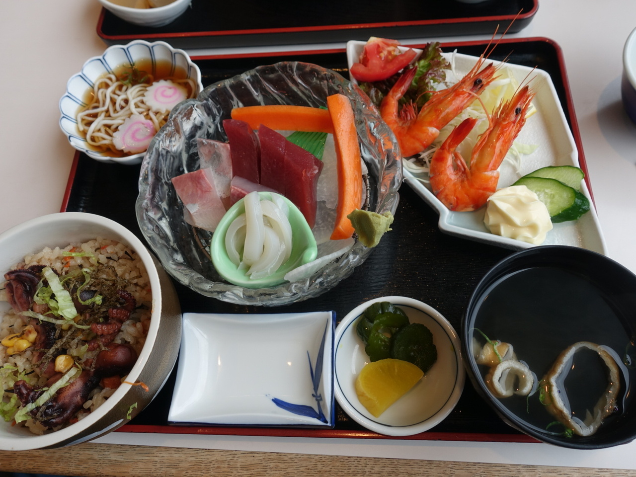 鳥羽駅直結の鳥羽一番街のレストラン街にありました。座敷があり、外の海や景色を眺めながらゆっくり食べることができます。たこ飯が食べたかったので、お刺身とたこ飯がある定食を食べました。とても美味しくて、ボリュームもありました。