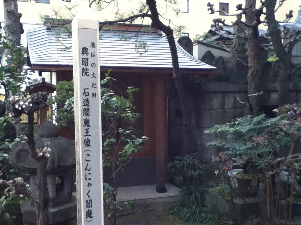 石造閻魔王像は興昭院境内の小屋の中に安置されている。境内は静かであった。お勧めの点は、石造閻魔王像は一部欠けているが、像高1m程度で笏を持ち方形の冠をつけ口を開いていること、この閻魔は眼病に霊験あらたかと言われ祈願者の願が成就した時にはお礼として「こんにゃく」を供える習わしとなっていたことである。訪問時の感想は、石造閻魔王像は怖い顔をしているように見えたが、がこのような当時の民間信仰を伝える石像があることを初めて知り訪問して良かった。
