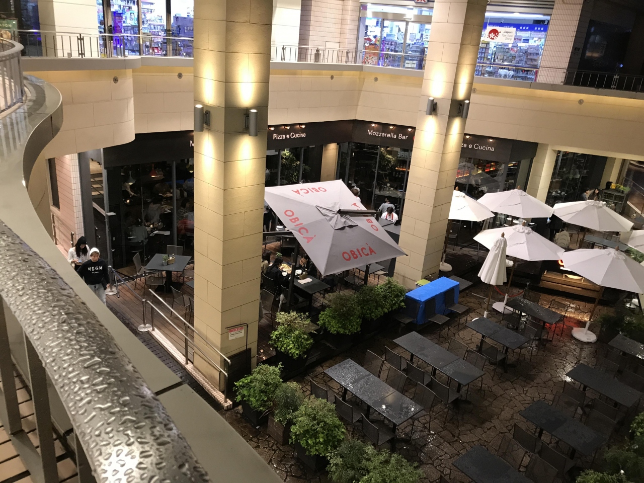 ウイング高輪の内部がそのまま店舗とオープンテラス状態になっています。好みでテラス席に行けますが、雨が降っていても大きな傘で防いでくれますが、ホテルへ向かう通行人の視線が気になります。イタリアンのお店なので定番のマルゲリータとワインを楽しみましたが、景色はホテルを行きかう人混みだけでした。