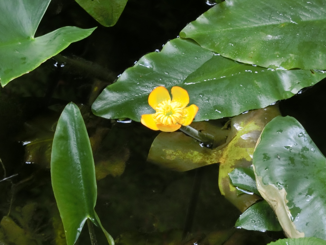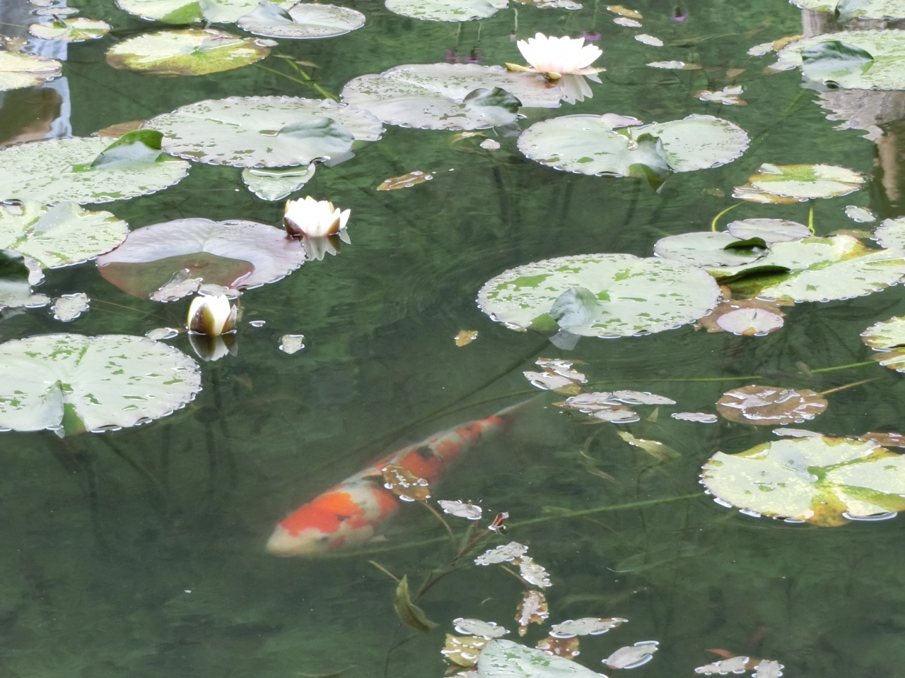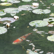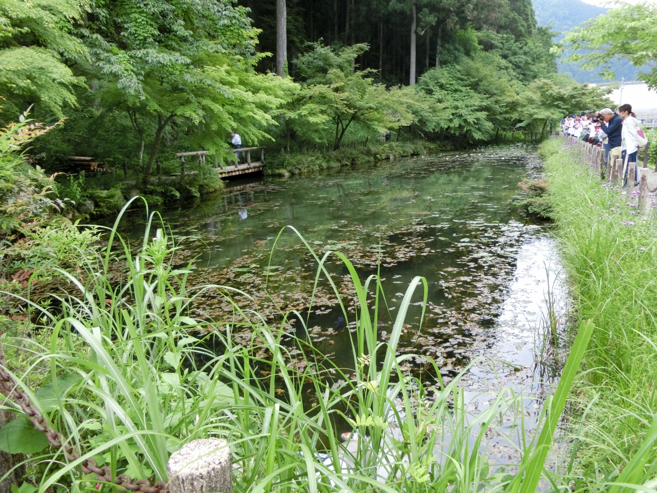 根道神社の参道脇にある貯水池。地元の人達が、根本神社の池とか単に池とか呼んでいるこの池にスイレンやコウホネを植えたそうです。スイレンやコウホネの花の下を、鯉が気持ちよさそうに泳いでいる小さな池ですが、何となくモネの睡蓮が連想できます。最初に“モネの池”とネーミングした人はすごい!