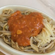 新潟のB級グルメのイタリアンを食べてみました。下は太麺のやきそばとなっており、上にミートソースがかかっています。他にクリームソースやカレーなどバリエーションがありました。これをパスタのようにして食べる面白い食べ物でした。
