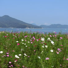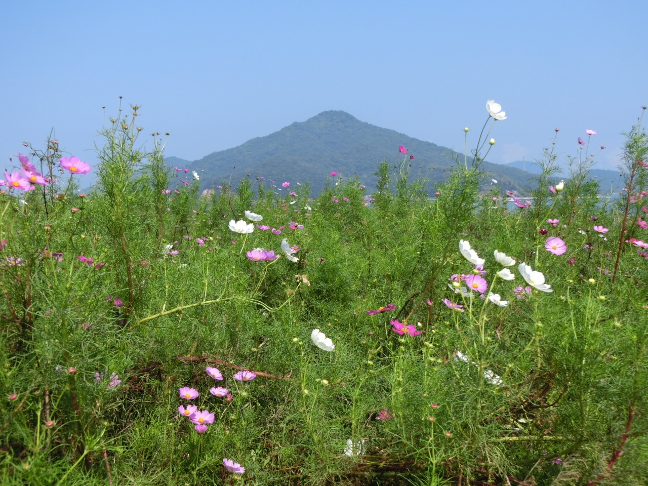 広大な農地に季節ごとの花が植えられた、市営の花畑。コスモスの花は満開状態でしたが、花が密生していなかったので感動がイマイチ、でもコスモスの花越しに瀬戸内海と浮かぶ小島の景色はきれいでした。マーガレットが満開になる5月の美しさは格別とのこと。次回は5月に行こう。