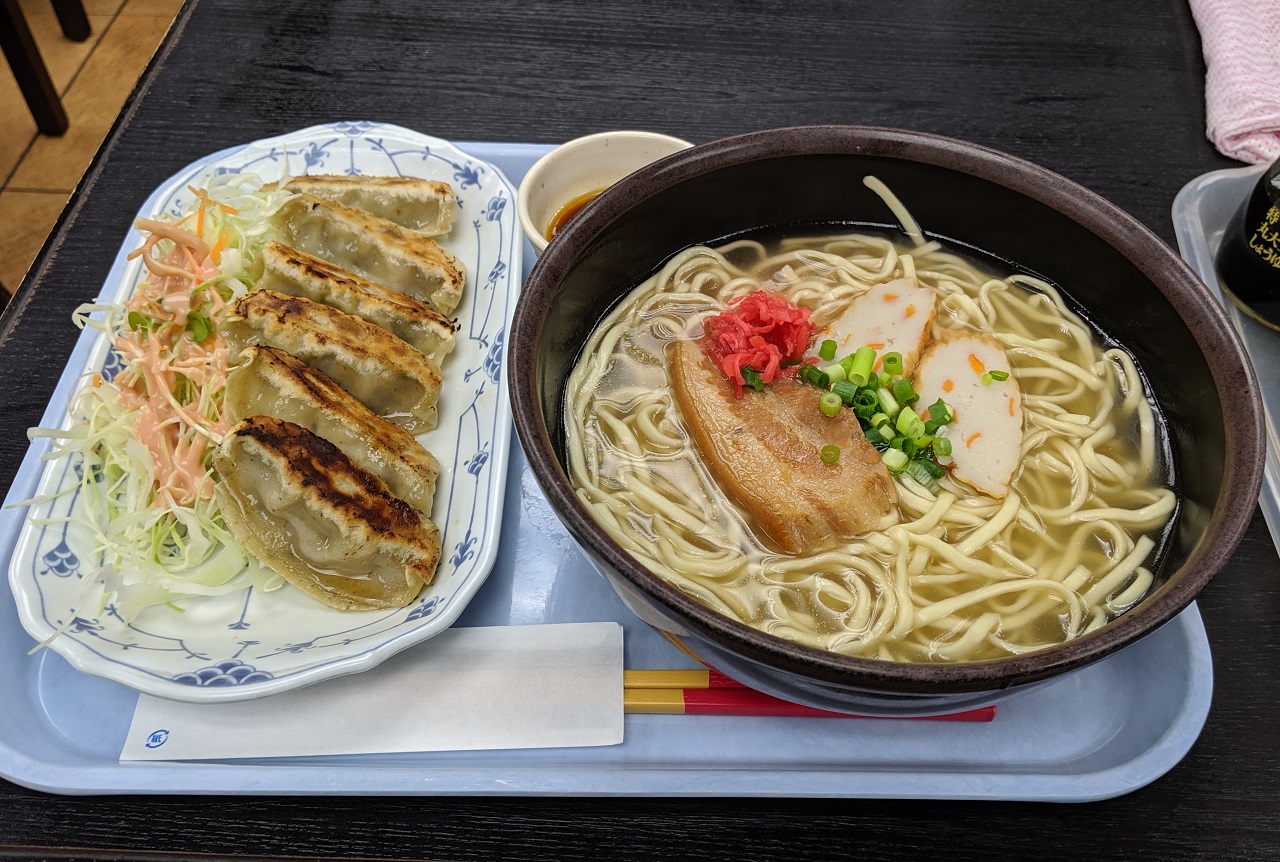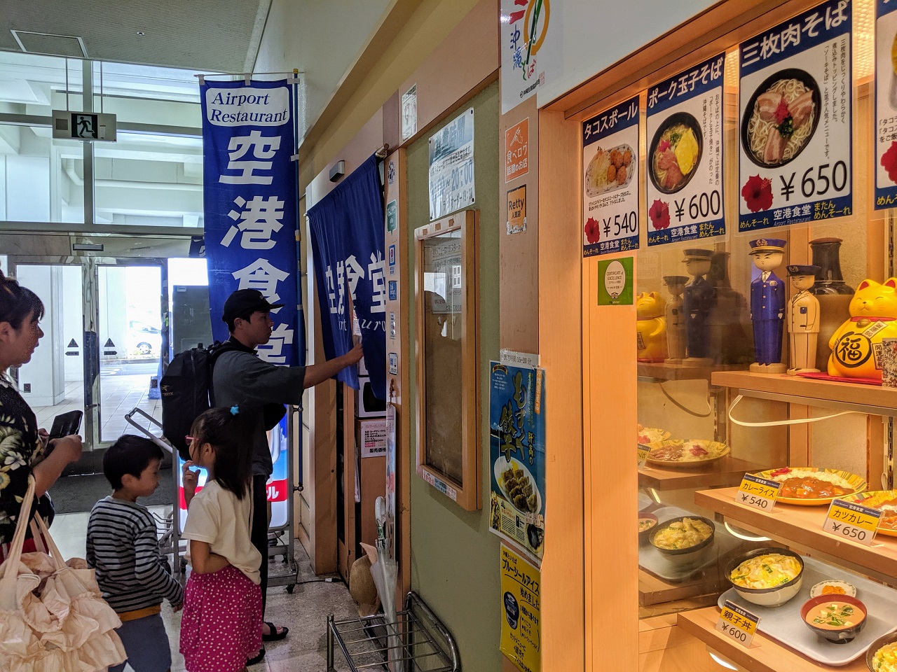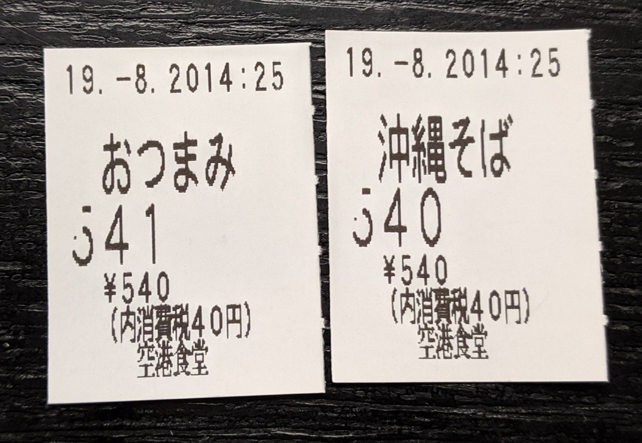 到着ロビーの琉球銀行奥にある空港食堂。食券を購入したらスタッフに半券を渡し、空いている席に座ります。料理ができると、食券に印刷された番号を呼ばれるので、スタッフに合図すると配膳してくれます。定食のおかずを単品で食べる場合は、"おつまみ"の食券を購入します。食事を終えたら、食器類は返却口までセルフで返します。今回は"沖縄そば"と"もずく餃子"を注文。合わせて1080円でお腹が満たされました。ごちそうさま。