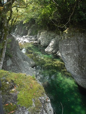 深耶馬溪は道沿いに土産物屋や食堂が軒を並べていて、それなりに観光地化されて俗っぽいのに比べ、奥耶馬溪は秘境といった趣き。周りにはほとんど何もありません。