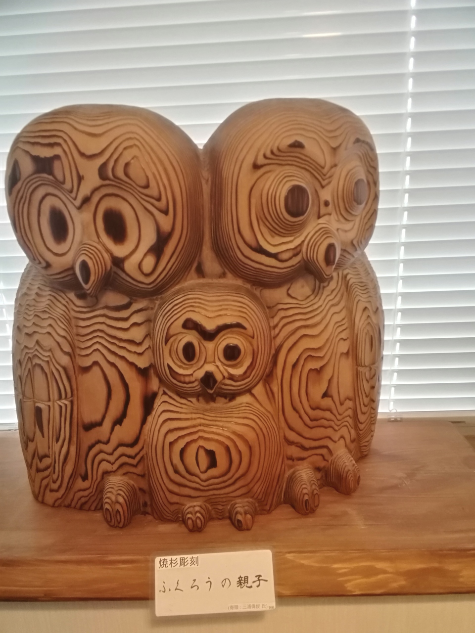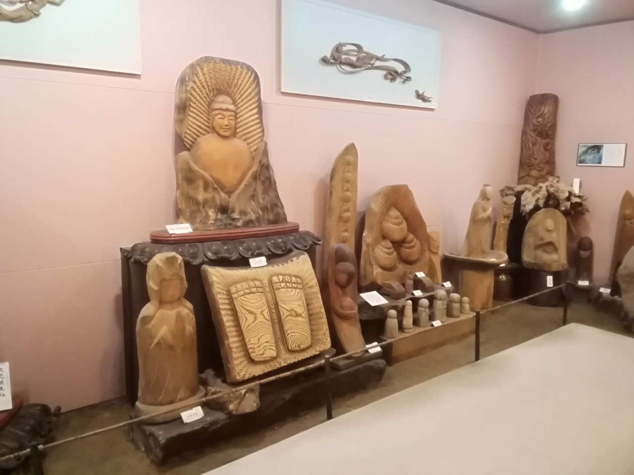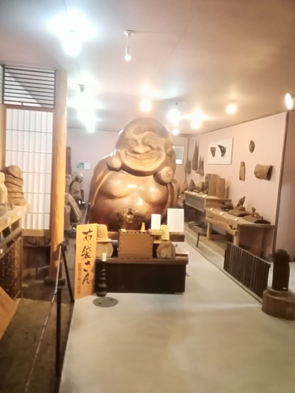 白壁土蔵群の中心にある赤瓦二号館は焼杉の彫刻が展示されている白壁土蔵です。玉川にかかる石橋を渡り中に入るとまず目に飛び込んでくるのは大きな布袋様の彫刻です。倉吉在住の仏師の一人、山本竜門先生の作品だそうで、その大きさと何とも言えない布袋様の表情に感動させられます。焼杉の彫刻が多数展示されており、見ていても飽きません。もう少し時間が欲しいと思いました。