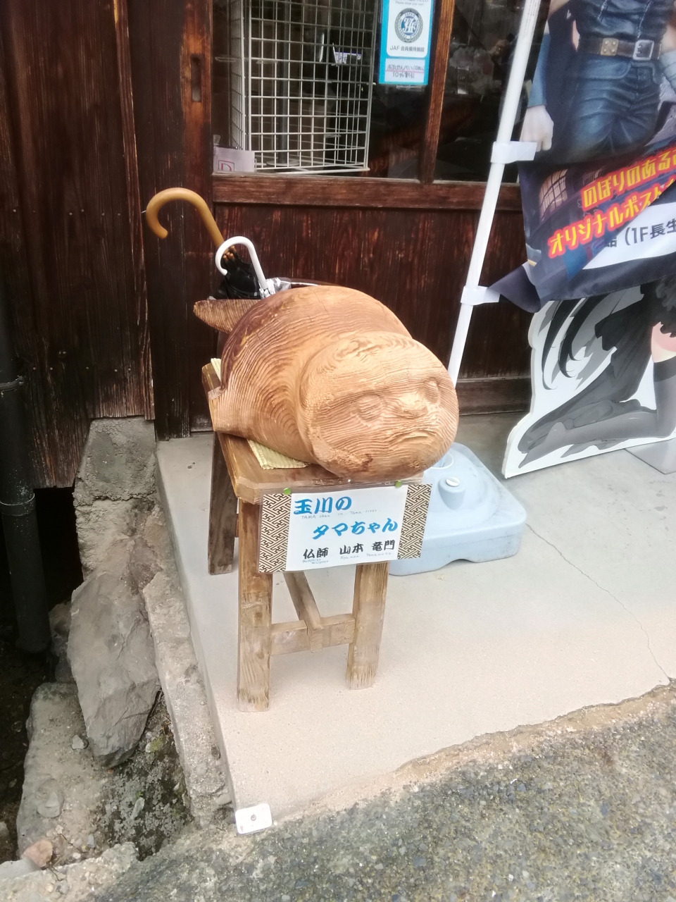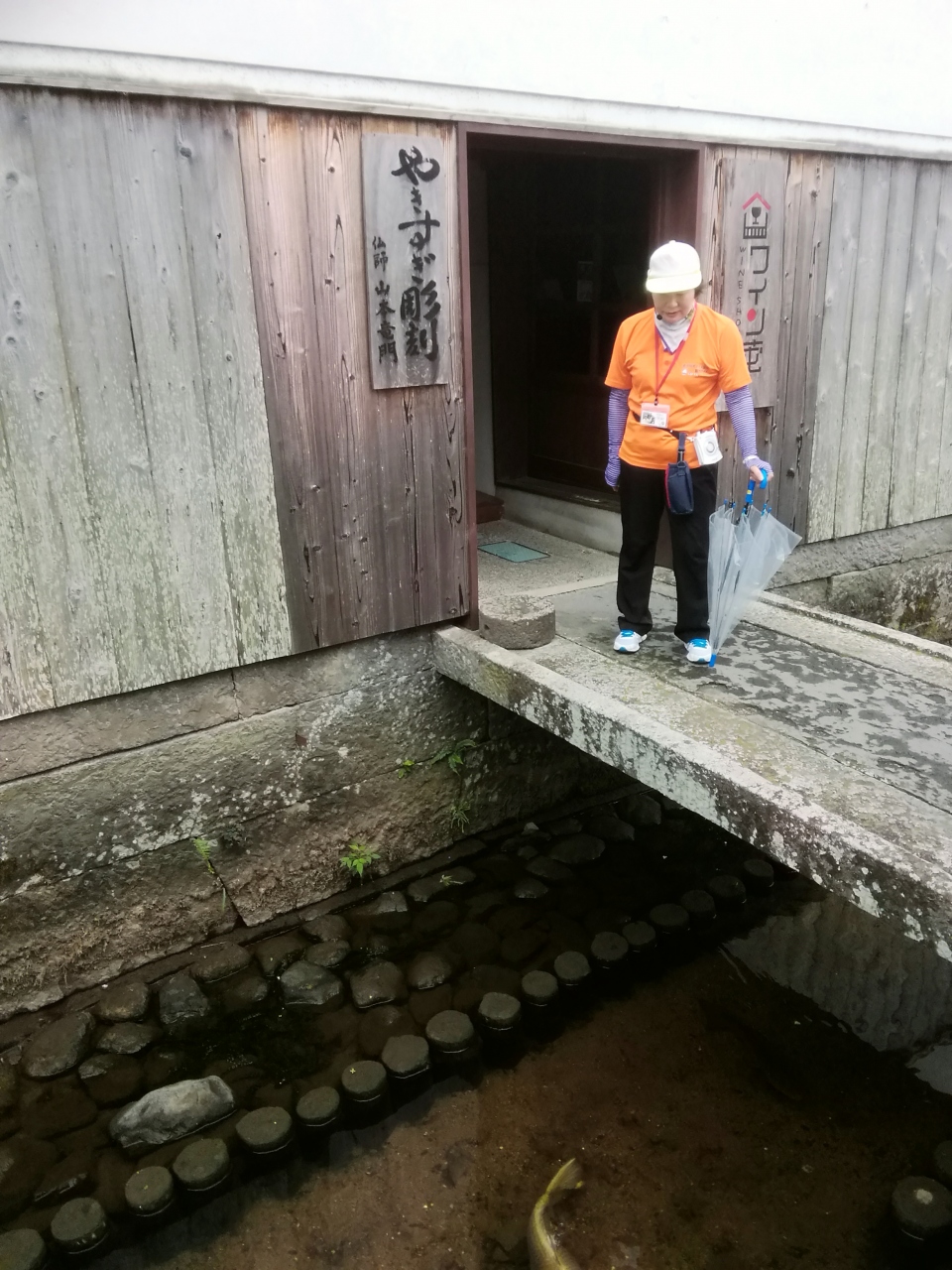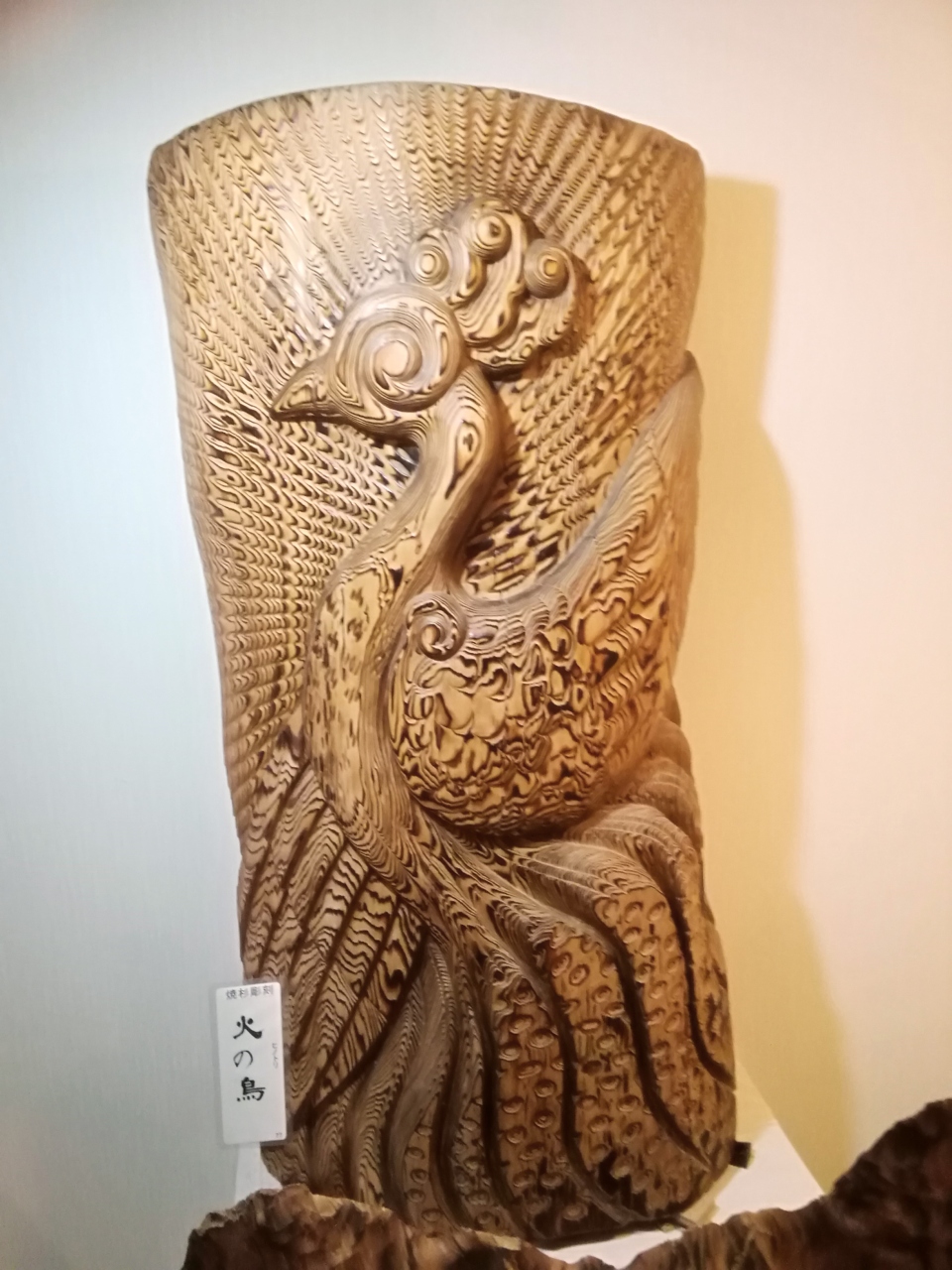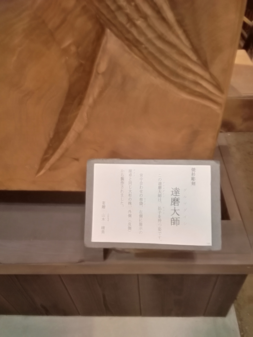 白壁土蔵群の中心にある赤瓦二号館は焼杉の彫刻が展示されている白壁土蔵です。玉川にかかる石橋を渡り中に入るとまず目に飛び込んでくるのは大きな布袋様の彫刻です。倉吉在住の仏師の一人、山本竜門先生の作品だそうで、その大きさと何とも言えない布袋様の表情に感動させられます。焼杉の彫刻が多数展示されており、見ていても飽きません。もう少し時間が欲しいと思いました。