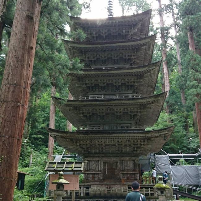羽黒山の山頂までの長い参道の途中、随神門から10分程度の場所にある五重塔です。国宝に指定された歴史ある五重塔で、彩色はされていませんが、杉の巨木を始めとした美しい自然の中にすっとたたずむ姿はとても美しく、神々しいです。