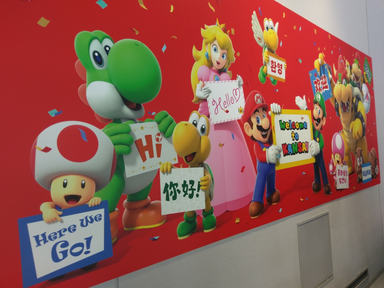 関西空港で国際線降機後直ぐにマリオの仲間達による歓迎広告を目にしました。ニンテンドーの広告というよりも外国人に日本を実感してもらえる計らいに感じます。第1ターミナルだからできる粋な演出のように思えます。日本語では「おかえりなさい」と表示されていました。
