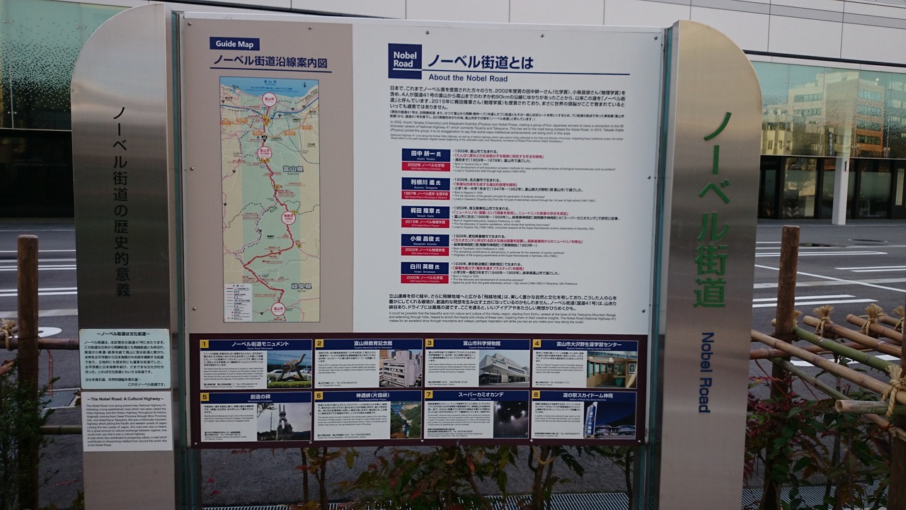 ノーベル賞を受賞した四名が富山から高岡までの国道41号線の90キロメートルの沿線にゆかりがあったことからこの道をノーベル街道と命名したそうです。