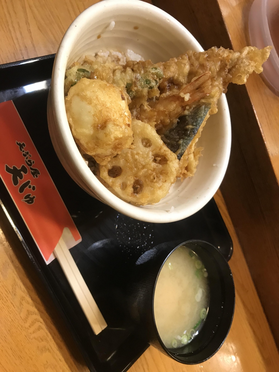 天丼専門のお店。えび天や野菜、アナゴなどがのった普通の天丼に半熟卵を追加して注文しました。具材のボリュームは寂しい感じだけど、1杯千円前後。味は普通ですが、タレが少ないのでテーブルに置いといてくれればよいのに。チェーンの天丼屋さんの方がコスパよく感じました。