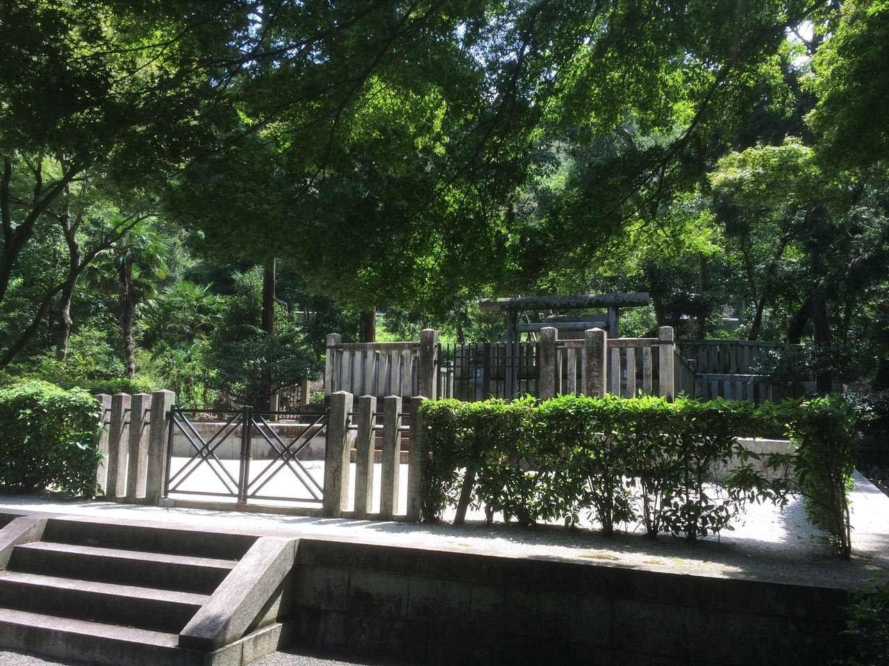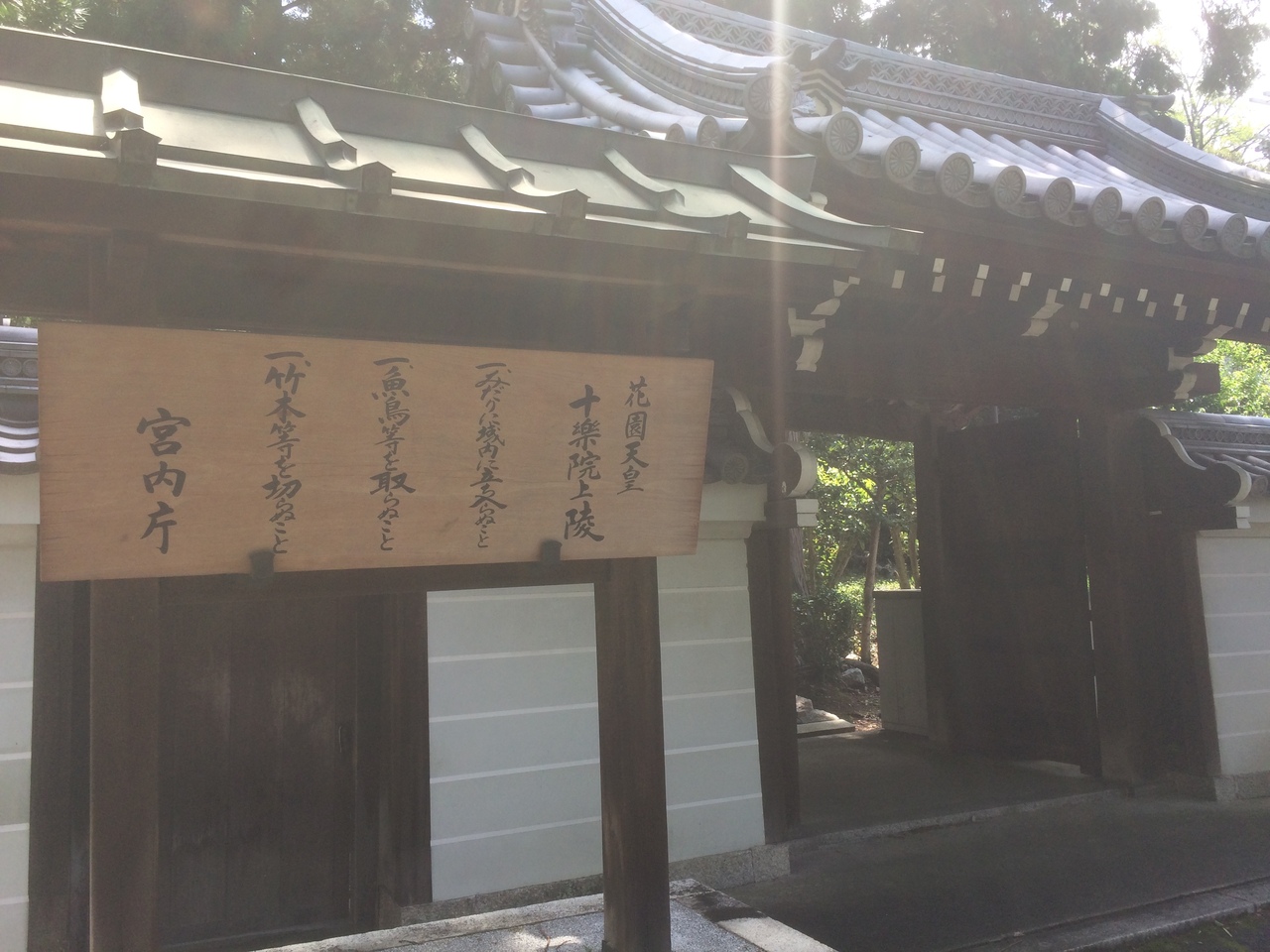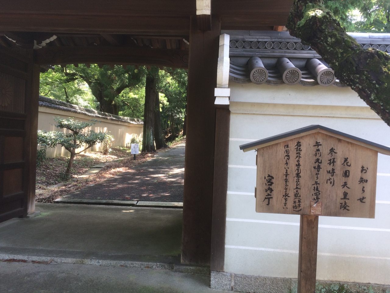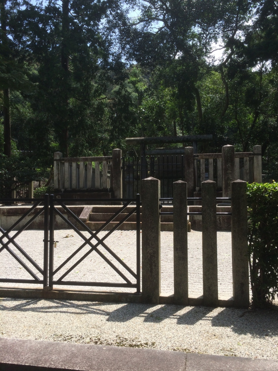 青蓮院門跡にほぼ隣室し、階段を数段あがると宮内庁管轄と書いてありました。門を潜ると緩やかな坂になっていて高い木が左右にそびえ静粛な感じでした。ところどころ道には苔が生え。周囲の竹藪も良い雰囲気でした。数段の階段を2回あがると拝殿になっていて柵のような門が2つあり、その後ろには鳥居があって木が生えていました。木陰あるので暫く天皇陵を眺めていました。