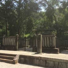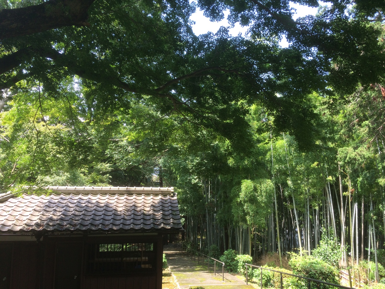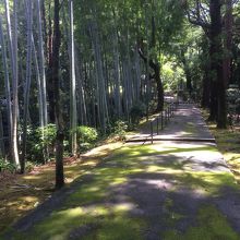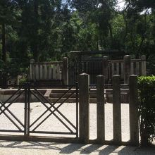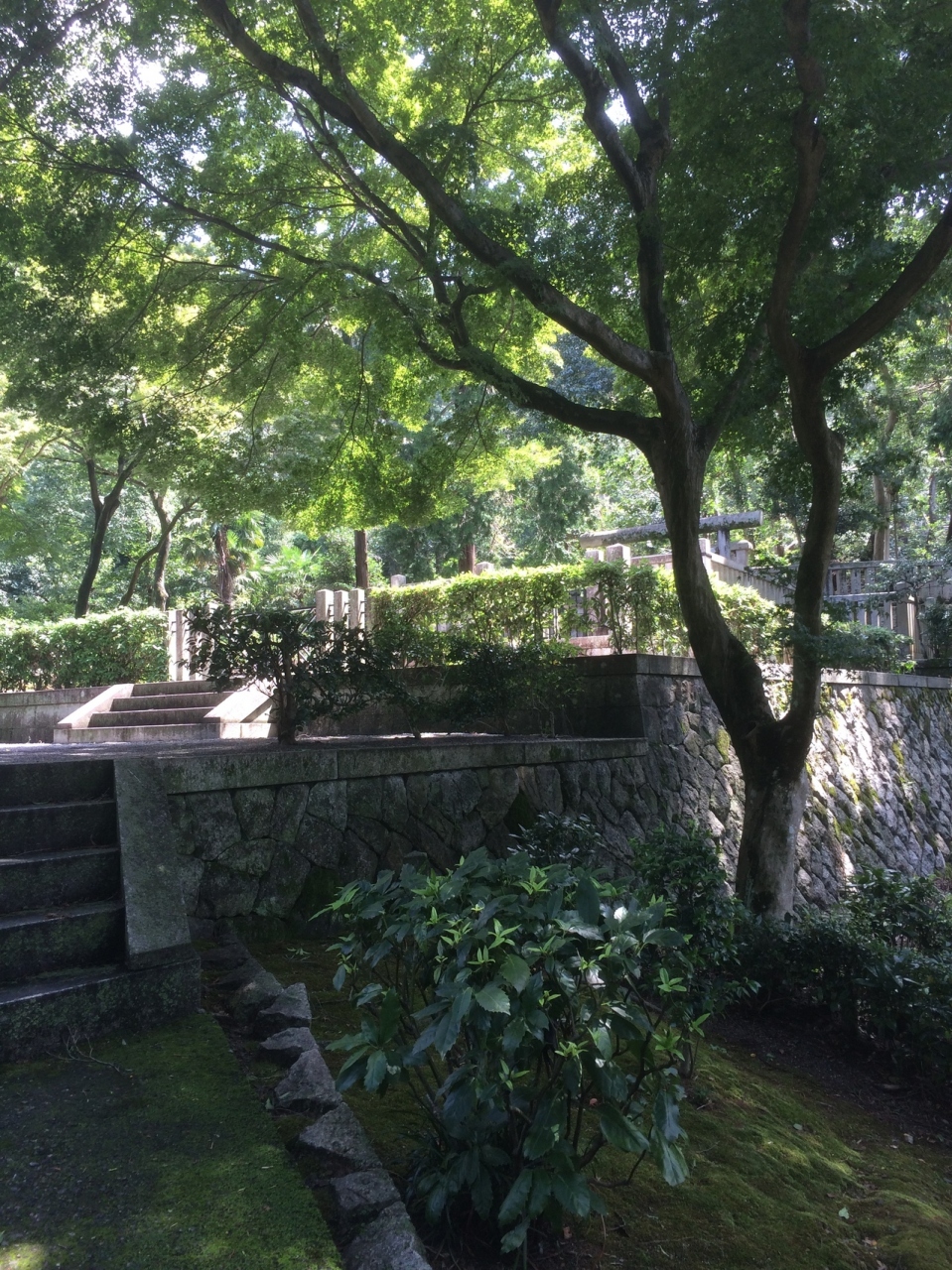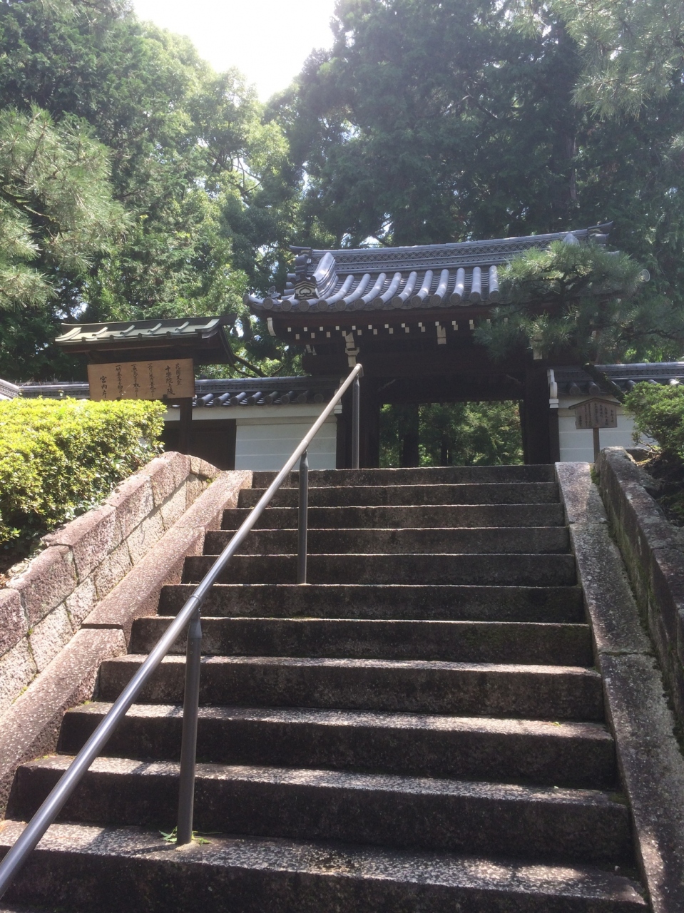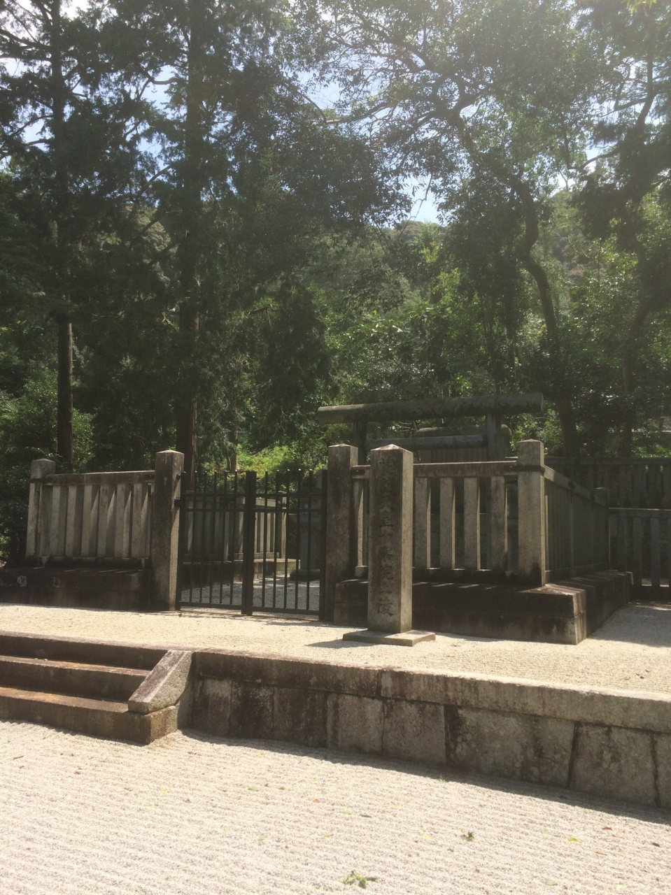 青蓮院門跡にほぼ隣室し、階段を数段あがると宮内庁管轄と書いてありました。門を潜ると緩やかな坂になっていて高い木が左右にそびえ静粛な感じでした。ところどころ道には苔が生え。周囲の竹藪も良い雰囲気でした。数段の階段を2回あがると拝殿になっていて柵のような門が2つあり、その後ろには鳥居があって木が生えていました。木陰あるので暫く天皇陵を眺めていました。