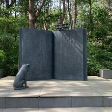 そとにある遊歩道を指差しの像に従って小田内沼を眺め進むと大きな文学碑が現れます