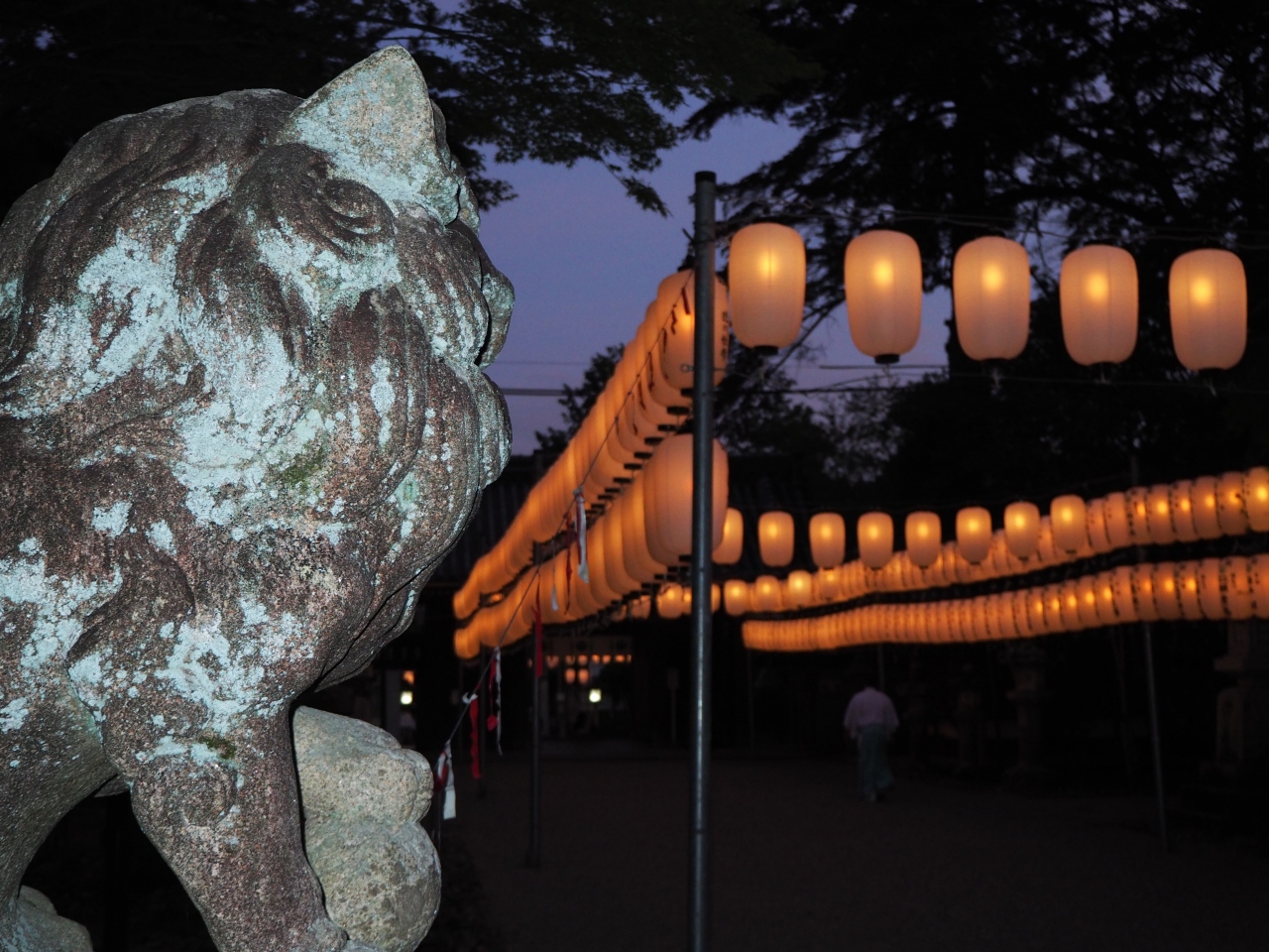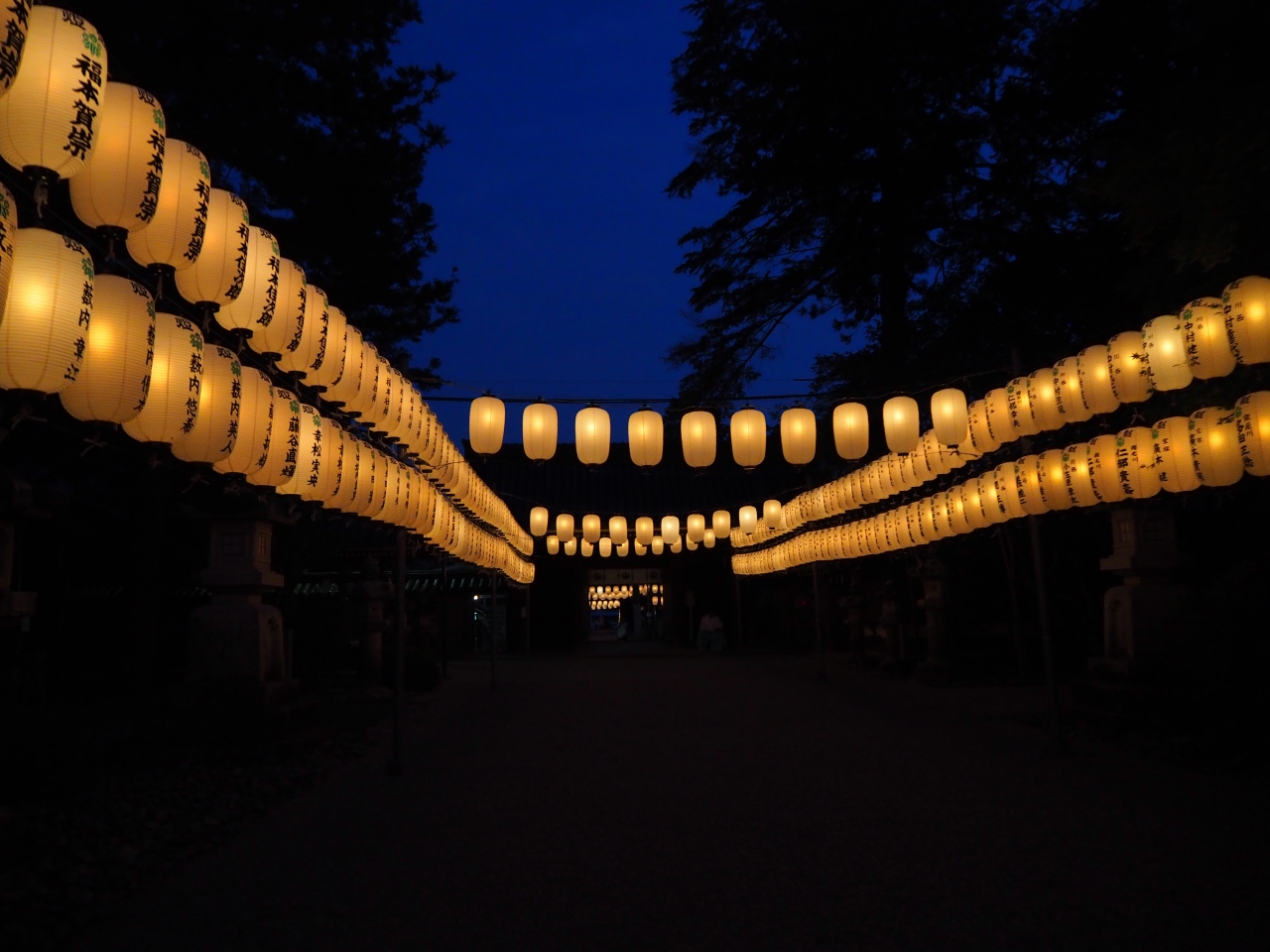 崇敬者により献灯された1000ほどの提灯が境内に掲げられ、点灯します。