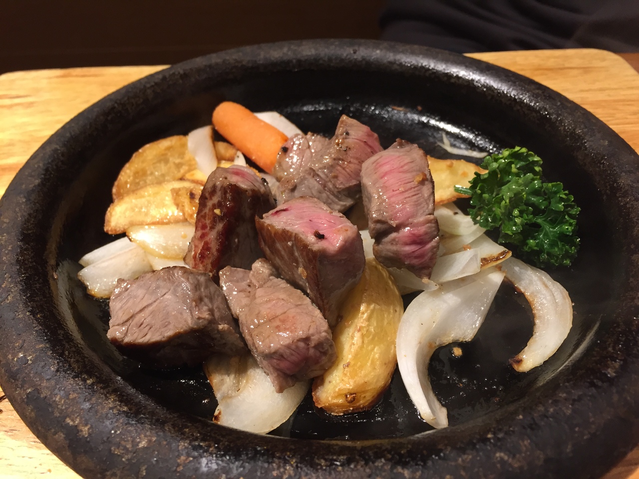 ランチにお伺いしました。12:30ほぼ満席でした。平日限定でお得なランチメニューがあり、宮崎産の厳選赤身ステーキ100グラム 1380円を注文。スープとご飯がセットで付いてきました。鉄板に乗せられて熱々で提供されました。テーブルの上に3種類のおソースのボトルがあり、好みで選べます。美味しくいただきました。