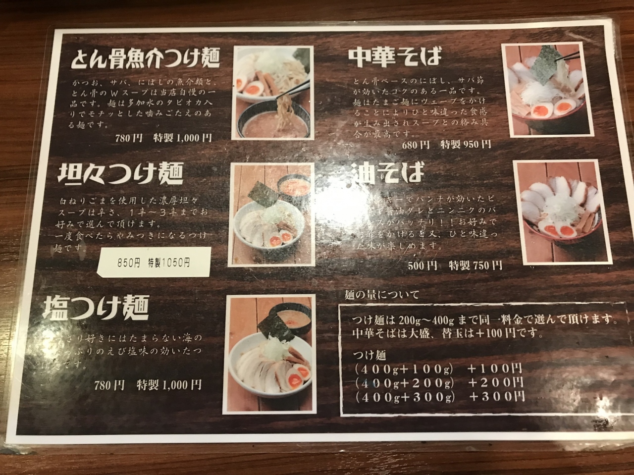 つけ麺は200、300、400gと同じ料金で選べます。それとは別に100gごとに100円で増量できます。とんこつ魚介系つけ麺、担々つけ麺、塩つけ麺があります。塩つけ麺400g、780円を注文。えび塩味のつけ汁です。駐車場なし。