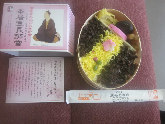 今回は、名松線旅のお供に、松阪の有名駅弁店のこちらで、本居宣長弁当を購入してみました。(商品名としては正確には弁当は旧字体表記となります。)以前は確か980円だったと思うのですが、最近値上がりしてしまったようで、1100円というお値段は、貧民にとってはかなりの贅沢でしたが、この駅弁店では、殆どがもっと高い松阪牛関連の駅弁ばかりなので、貧民の方には、こちらのお弁当か、前回ご紹介したモー太郎寿司か、選択肢はないかなと思われます。