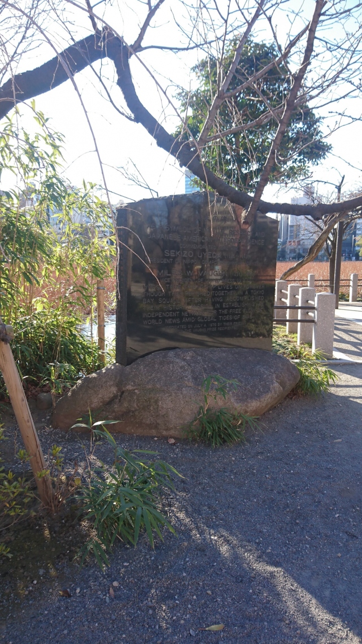不忍池の弁天島にある石碑群の中に黒光りする石に英語で刻まれたものがありました。「真友」の文字が漢字で記されていますが、何を意味するのかわからず、感動も何もありませんでした。後で調べてみると、ジャーナリストの世界で知られる「上田・ボーン賞」の上田氏とボーン氏が東京湾の突風で亡くなったことを悼む碑とのことでした。