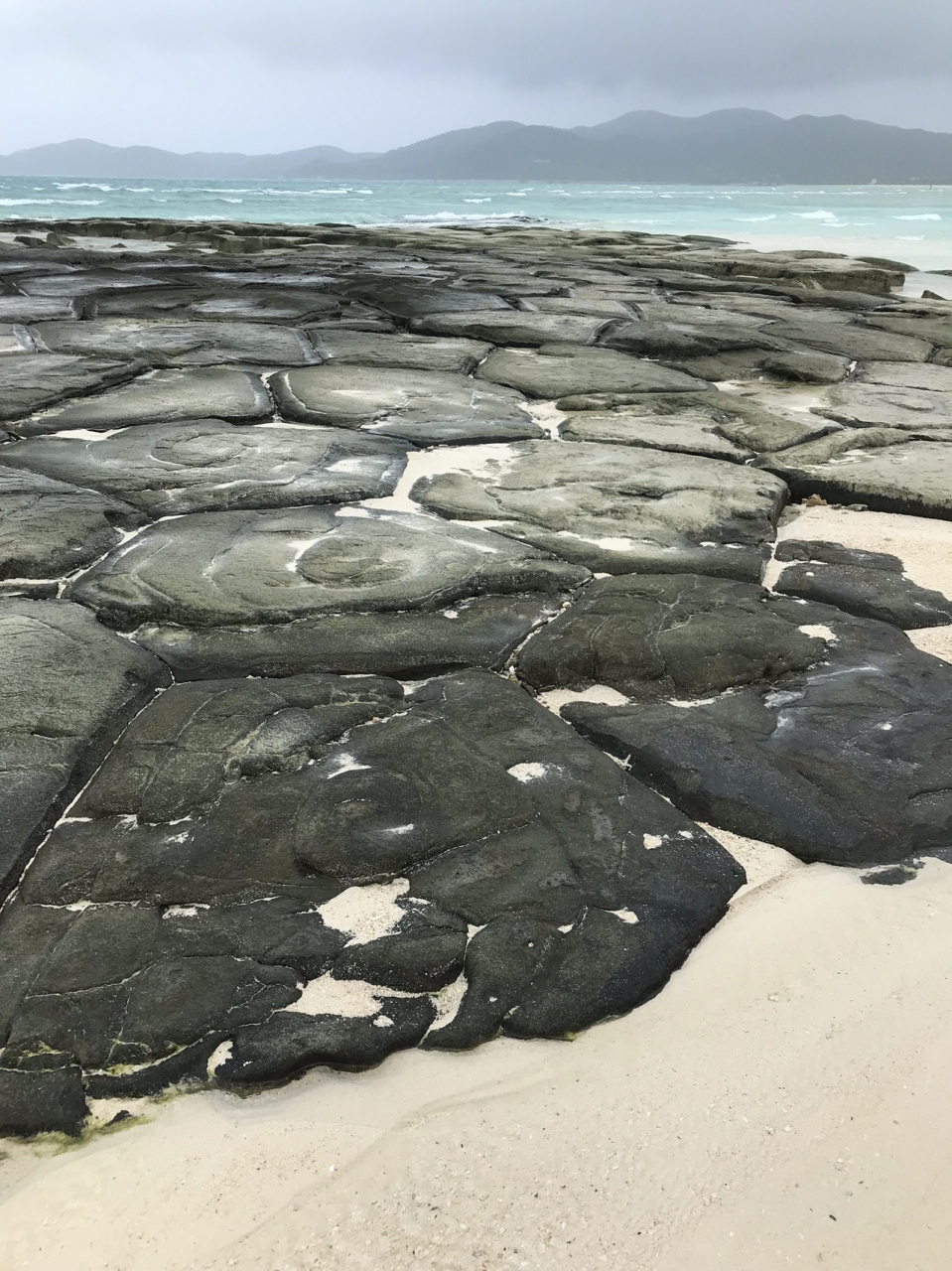 亀の甲羅のような、何とも不思議な石の連なり。自然に出来上がったものとは不思議でした。あいにくの天気だったので、真っ青の海と真っ青の空とはいきませんでしたが、天気のいい日はさぞ絶景でしょう。砂浜も真っ白でとてもキレイです。